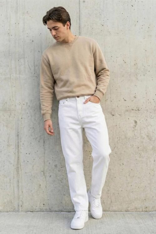 Relax Fit Denim Pant – White Elevate your everyday wardrobe with these premium White Mom fit jeans. Crafted from durable cotton denim, these versatile trousers feature a comfortable high-rise waist.