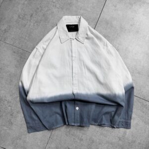 Garment Type: Oversize long-sleeve button-down shirt. Color & Style: The shirt is a vibrant electric blue that transitions into a slightly darker shade, suggesting an ombre or gradient dye effect, particularly towards the bottom and cuffs. Fit: It has a distinct oversize/relaxed fit with a generous cut and dropped shoulders (indicated by the seam placement). Collar: Features a classic point collar. Closure: It is a full-button front shirt with…