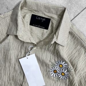 A perfect balance of minimal design and subtle detail, this shirt features fine vertical stripes complemented by elegant floral embroidery for a soft yet distinctive look. The dropshoulder fit adds a relaxed, modern edge, while the white base keeps it clean and versatile. Ideal for everyday wear, this piece brings together comfort, craftsmanship, and understated style in one refined silhouette. Size :M L XL