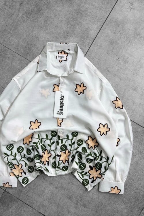 Monochrome Floral Border Embroidery Shirt – White Elevate your streetwear collection with this white long-sleeve shirt by Gangster. Crafted from breathable fabric, it features a unique design with heavy, contrasting black floral embroidery along the bottom hem and subtle motifs on the chest. The relaxed, drop-shoulder fit makes it perfect for casual outings or party…