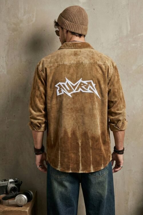 Auvra Back Printed Oversize Corduroy Shirt- Brown “Shop this oversized Light tan Streetwear Shirt featuring a premium Brown acid-wash finish and bold Auvra back graphic. Trendy, soft-touch button-down for an urban look.”