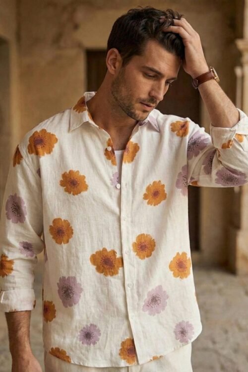 Bamboo leaf printed Oversize Linen Shirt “Elevate your casual style with this off-white floral print shirt. Features a relaxed fit, breathable fabric, and bold black leaf patterns. Perfect for a trendy summer look.”