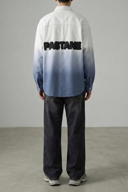 Pastane Oversized Shirt – White & Blue Elevate your fit with the Pastane Oversized Ombre Shirt. Features a premium white-to-Blue gradient dip-dye, heavy cotton fabric, and bold back typography.