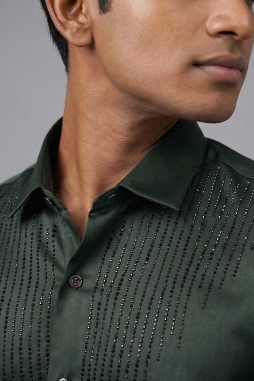 Emerald Luxe Crystal Panel Shirt – Green Elevate your style with this emerald green crystal panel shirt, featuring a smooth satin finish and refined embellishments for premium occasions.