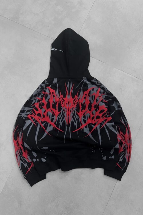 Dark aesthetic unlocked. ⛓️ Upgrade your rotation with this heavyweight black oversized hoodie. Featuring aggressive red and grey tribal graphics on the front, back, and sleeves, it’s designed for maximum impact. Premium drop-shoulder fit for that perfect streetwear look. Tap to cop! 🦇🩸