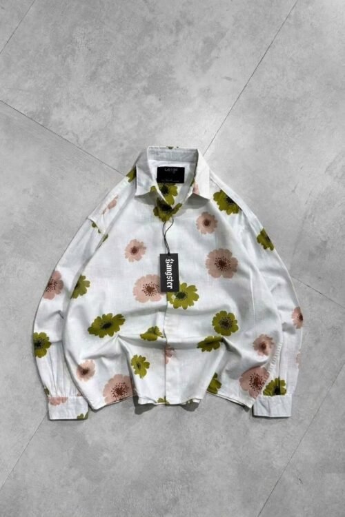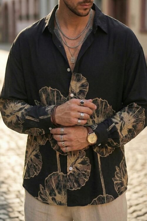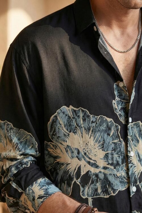 Midnight Bloom Dropshoulder Shirt Black oversized shirt with bold floral print. Soft Rayon fabric, relaxed dropshoulder fit—perfect for modern streetwear and casual styling.