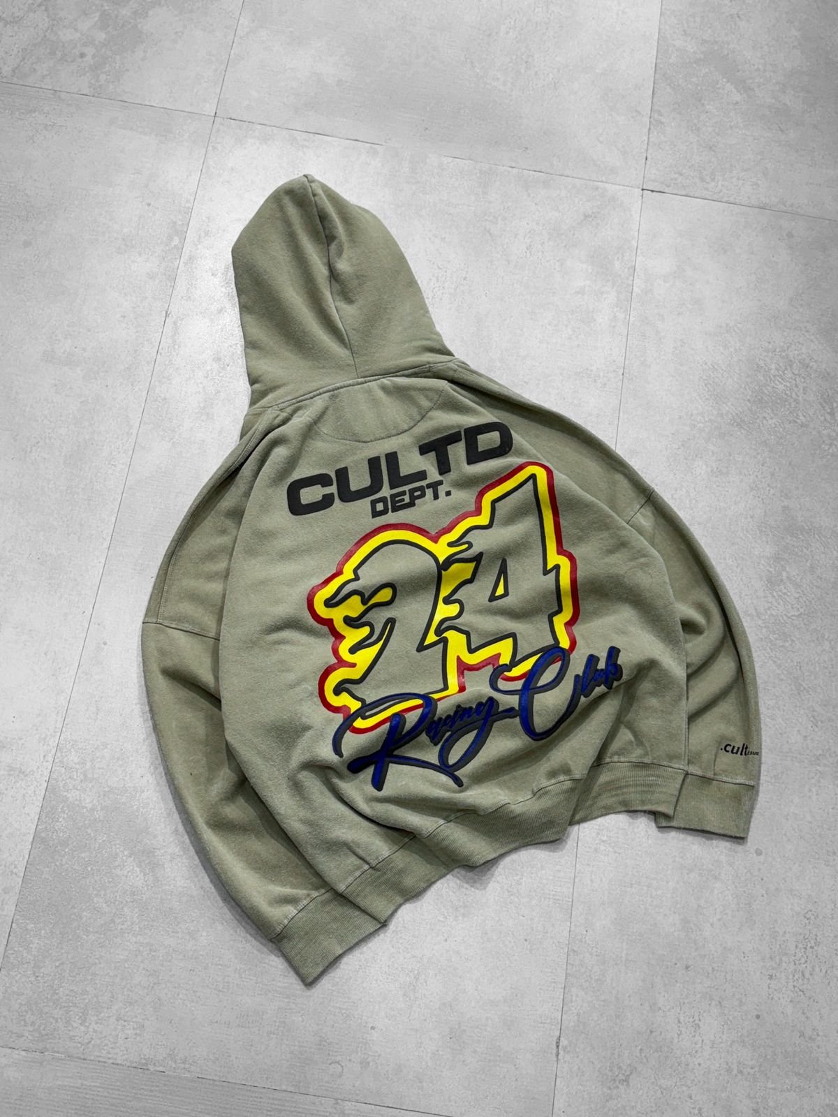 Shop the 24 Racing Club oversized hoodie in olive green with bold back graphic and minimal front branding. Premium fabric, relaxed fit, streetwear essential.