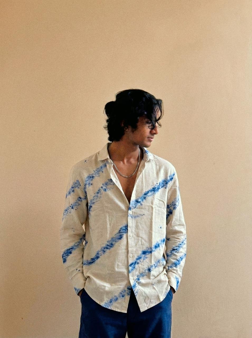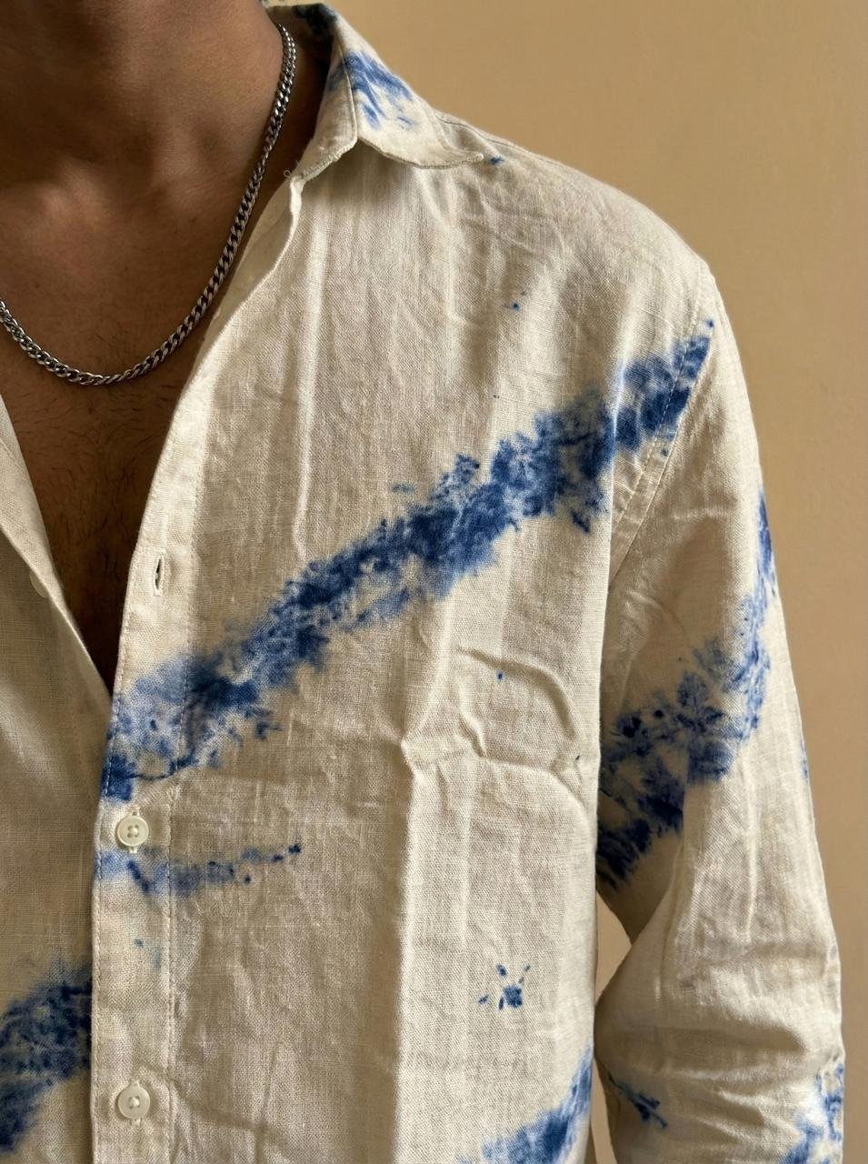 “Upgrade your summer style with our Blue Diagonal Tie-Dye Shirt. Crafted from breathable fabric with a unique artistic blue stripe, this relaxed-fit button-down is perfect for casual wear.”