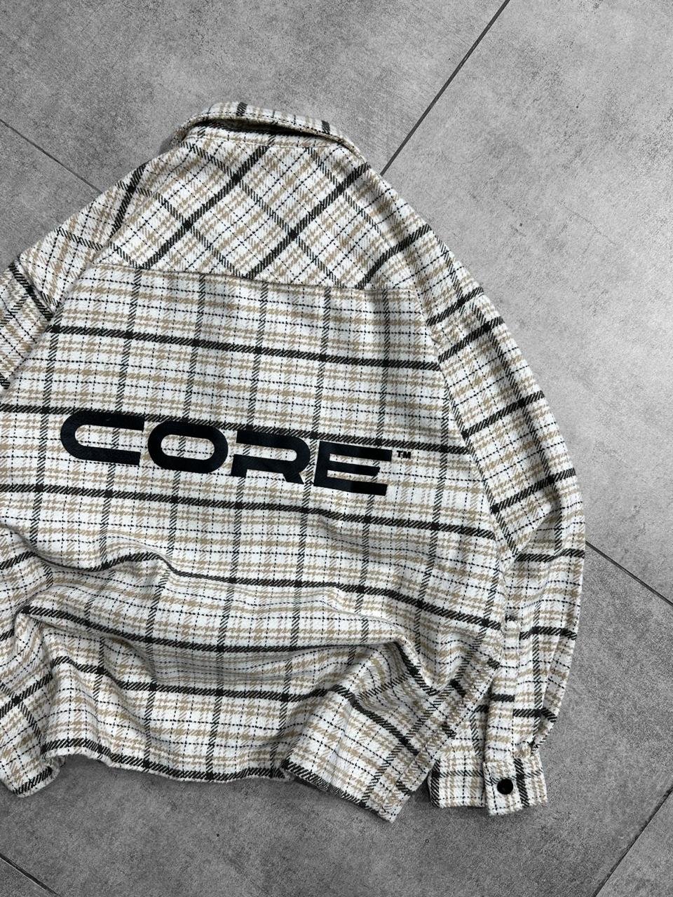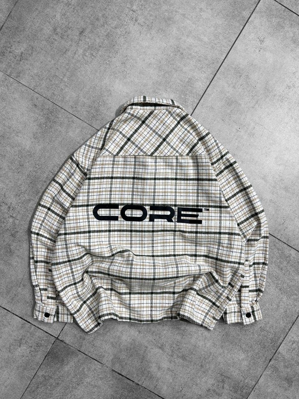 Men’s Half white Green Plaid Quarter-Zip Flannel Shirt with “CORE” Back Print. This trendy streetwear pullover features a dark green checkered pattern, a half-zip collar, and bold white “CORE” lettering across the back. Perfect for casual layering and urban style.