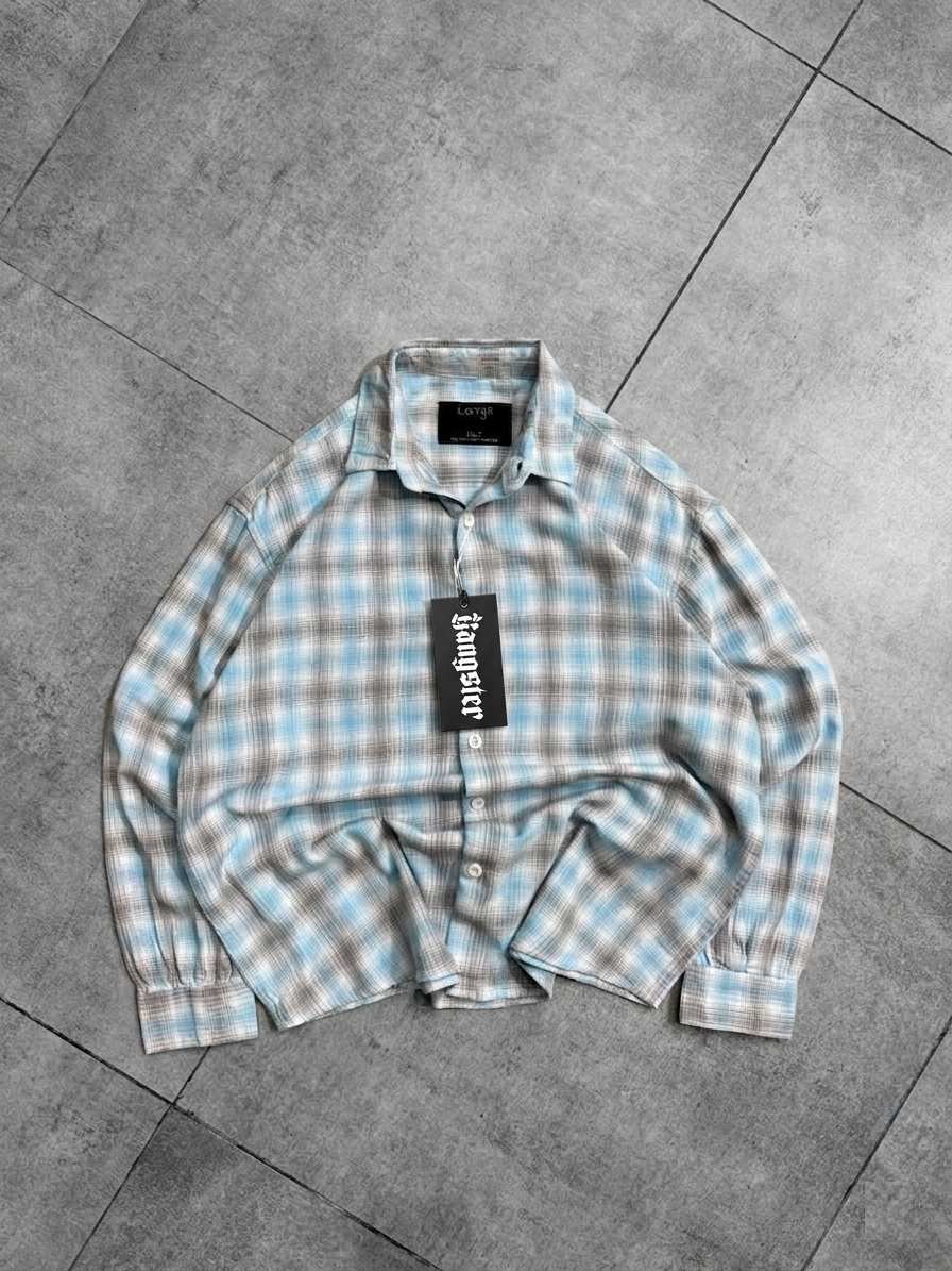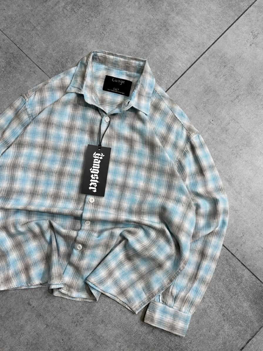 A cropped plaid button-up shirt featuring a soft checkered pattern, classic collar, and relaxed fit. Designed with a modern cropped length, it blends casual comfort with a clean, laid-back aesthetic.
