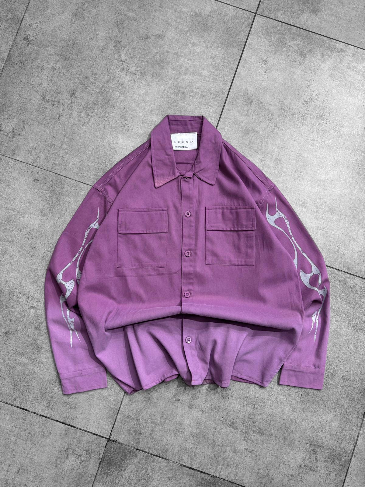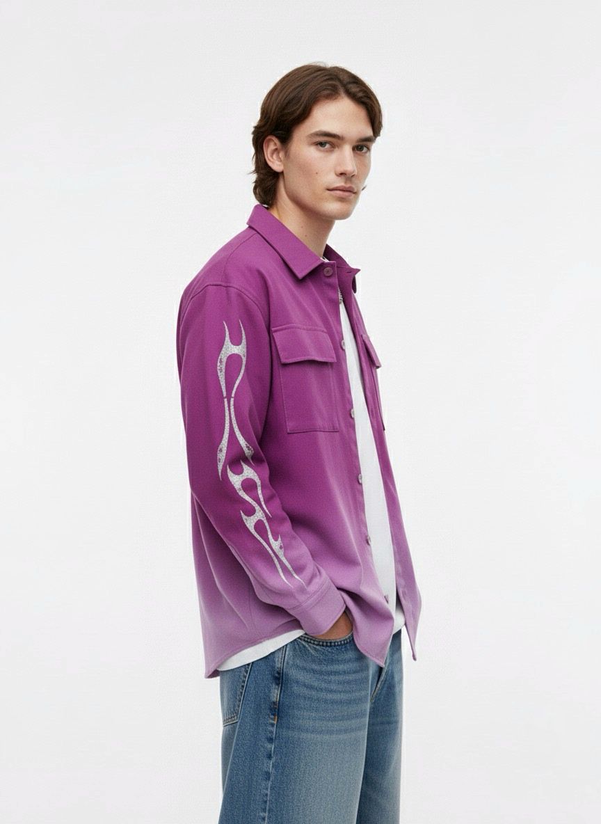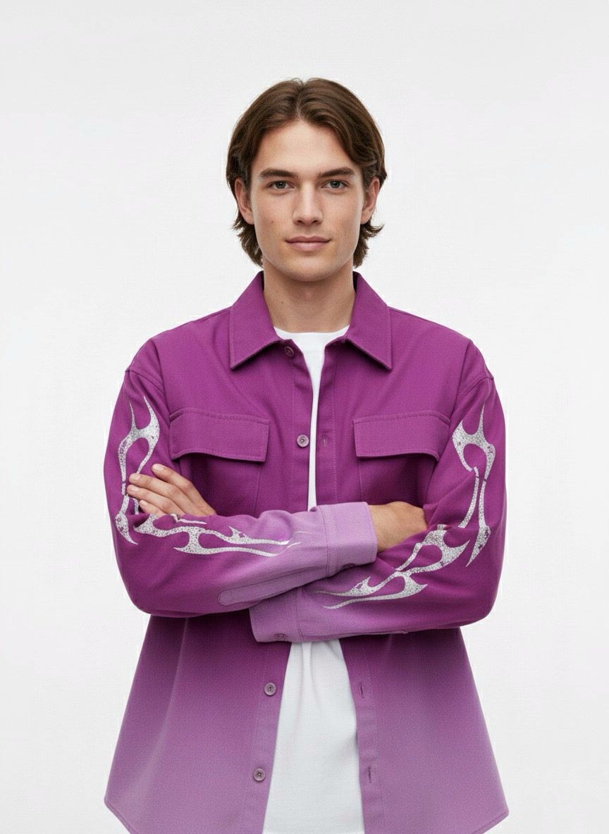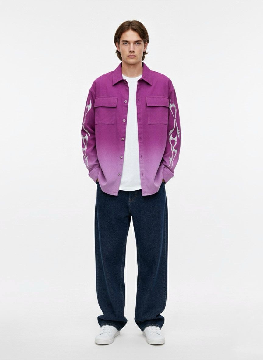This shirt combines a utilitarian silhouette (pockets, collar) with a streetwear aesthetic (oversize fit, flame graphics, and gradient color)