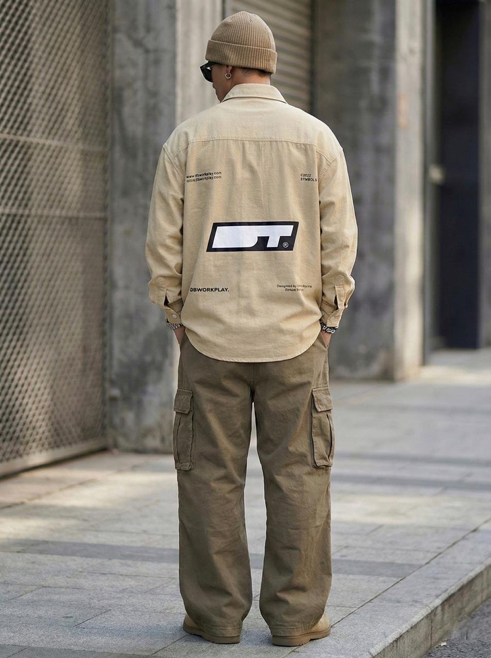 - “Shop this oversized Light tan Streetwear Shirt featuring a premium acid-wash finish and bold DBWORKPLAY back graphic. Trendy, soft-touch button-down for an urban look.”