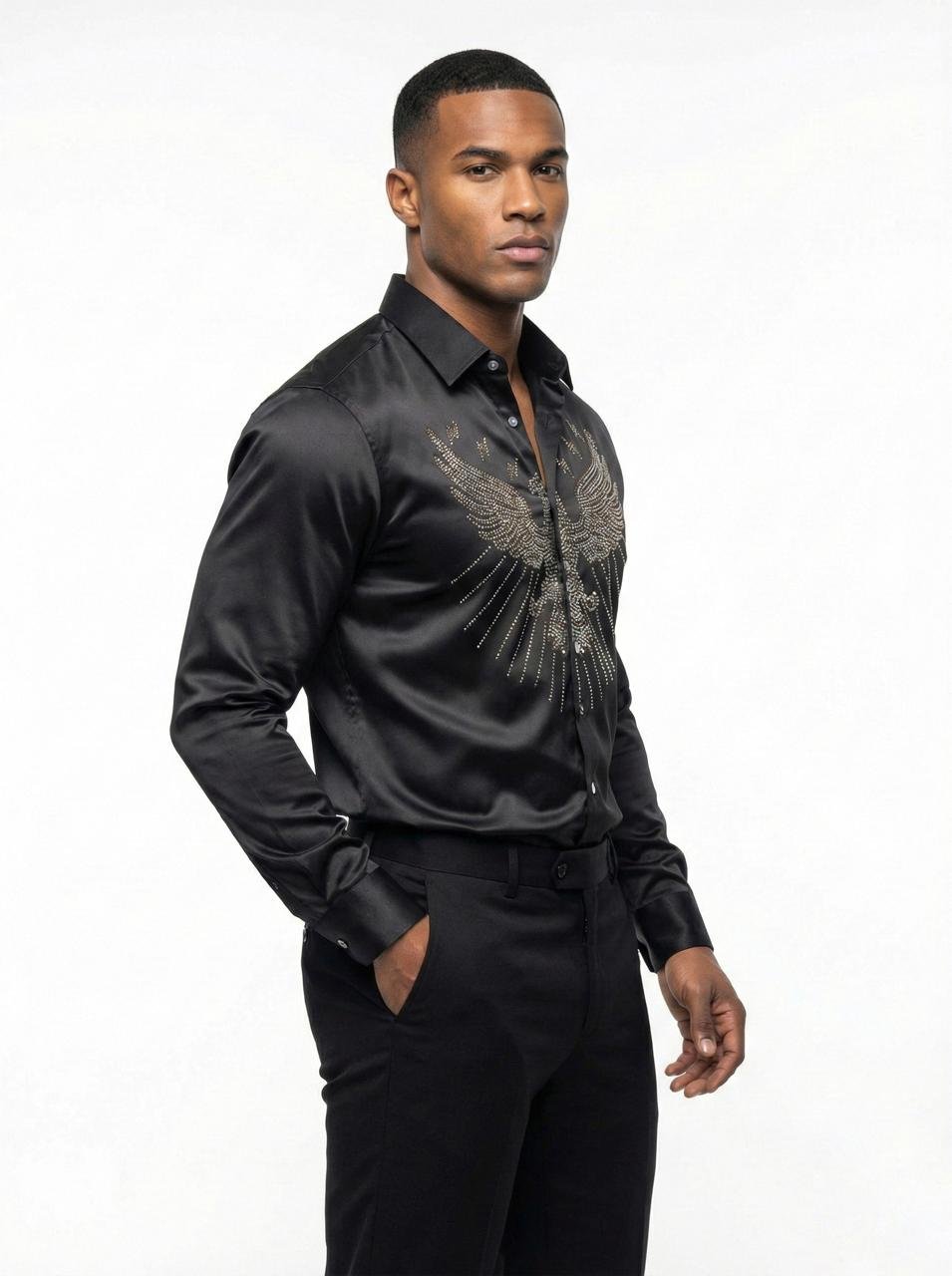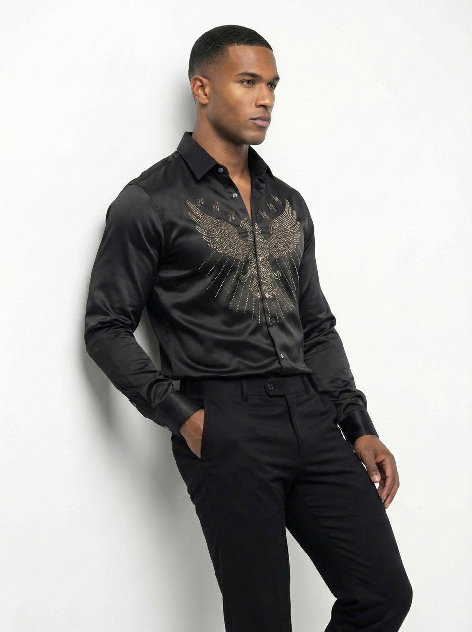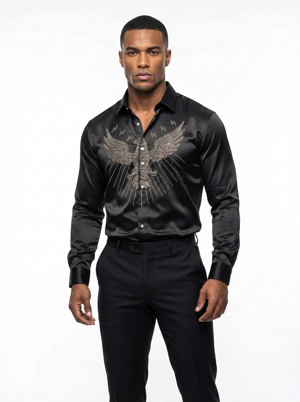 - Dark Black premium shirt featuring a striking rhinestone eagle chest design, tailored fit, smooth finish, and a bold luxury statement perfect for party and evening wear.