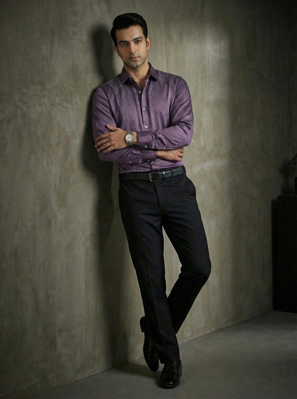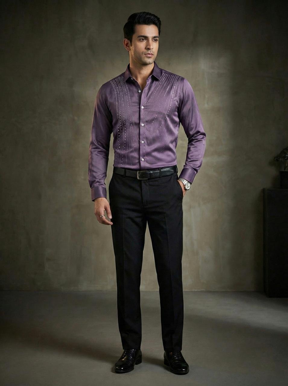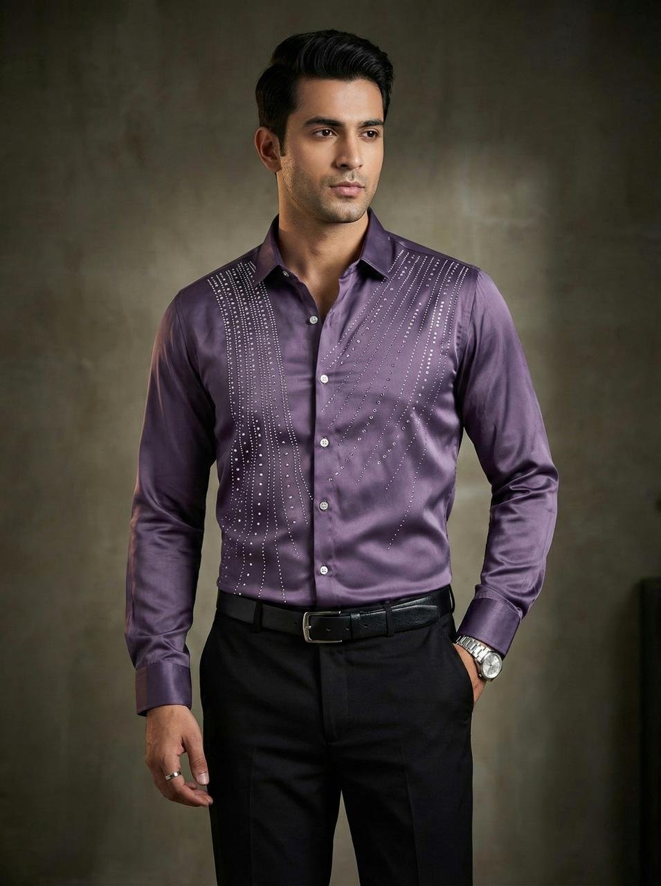 • Elevate your style with this emerald Purple crystal panel shirt, featuring a smooth satin finish and refined embellishments for premium occasions.