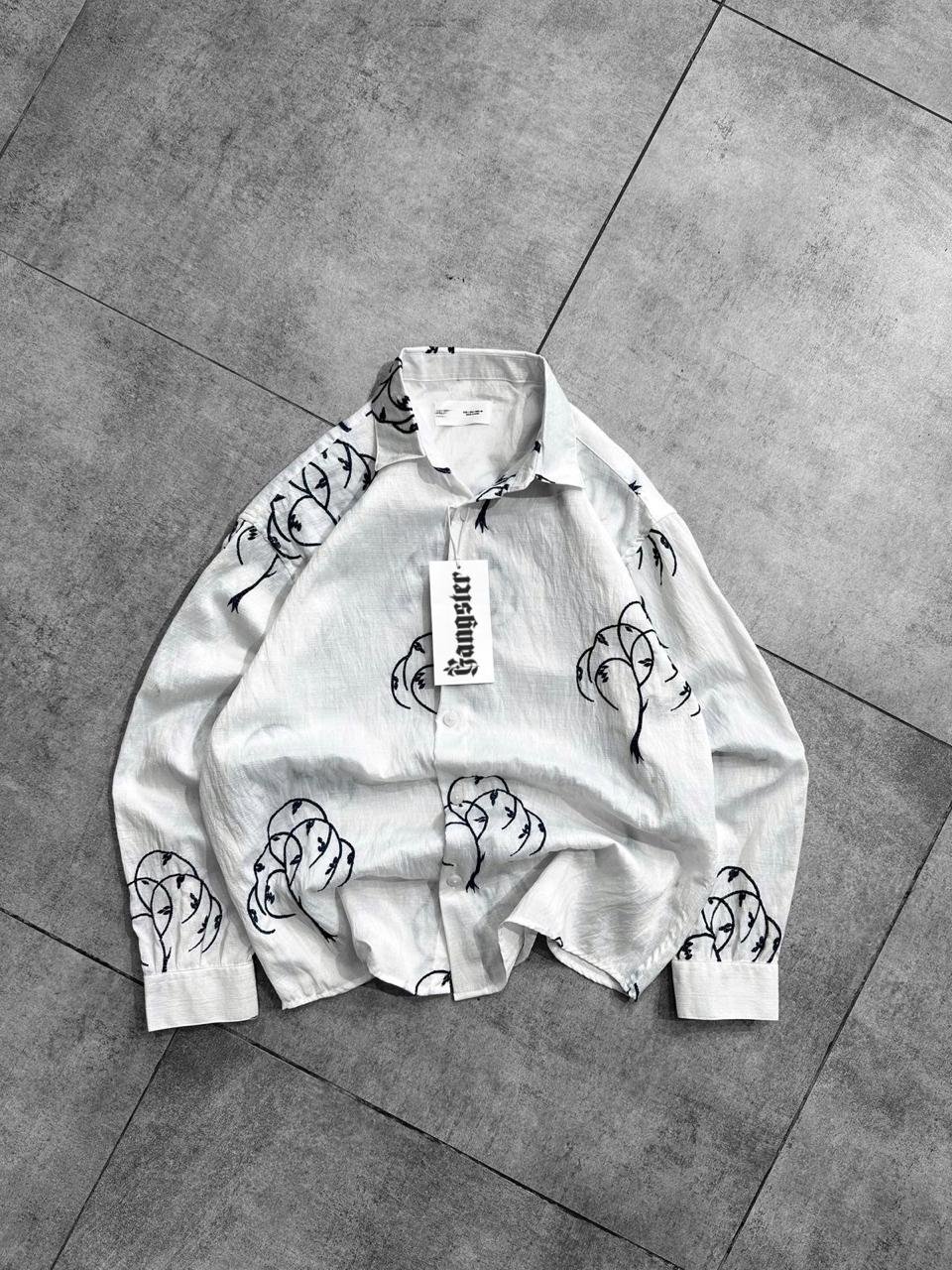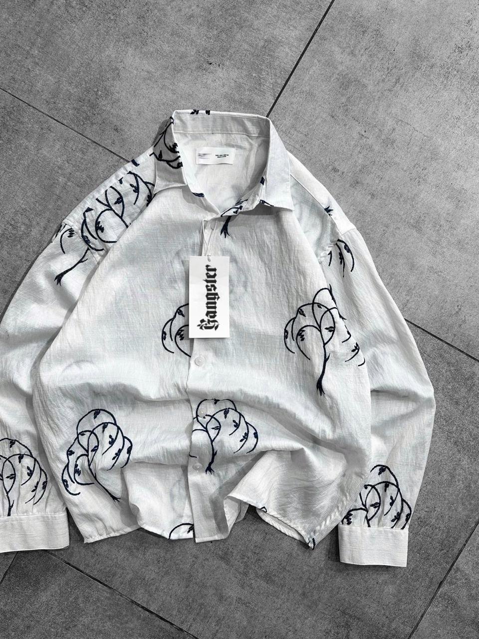 This premium white crinkle-textured shirt features bold, black abstract line-art face embroidery. Designed with a modern, oversized aesthetic, it blends high-street fashion with minimalist artistic elements.
