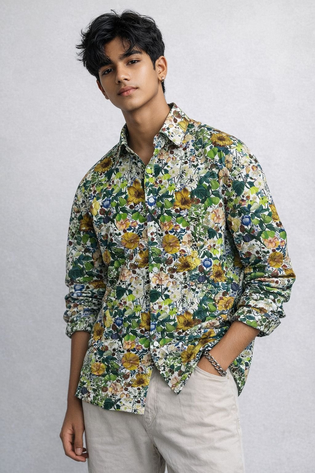 Floral Vibe Street Shirt is where retro charm meets modern street attitude. Designed with an all-over digital floral print, this shirt brings bold energy and effortless style to your everyday look. The relaxed drop-shoulder fit gives you that oversized streetwear silhouette, making it perfect for casual outings, college days, or weekend hangouts.