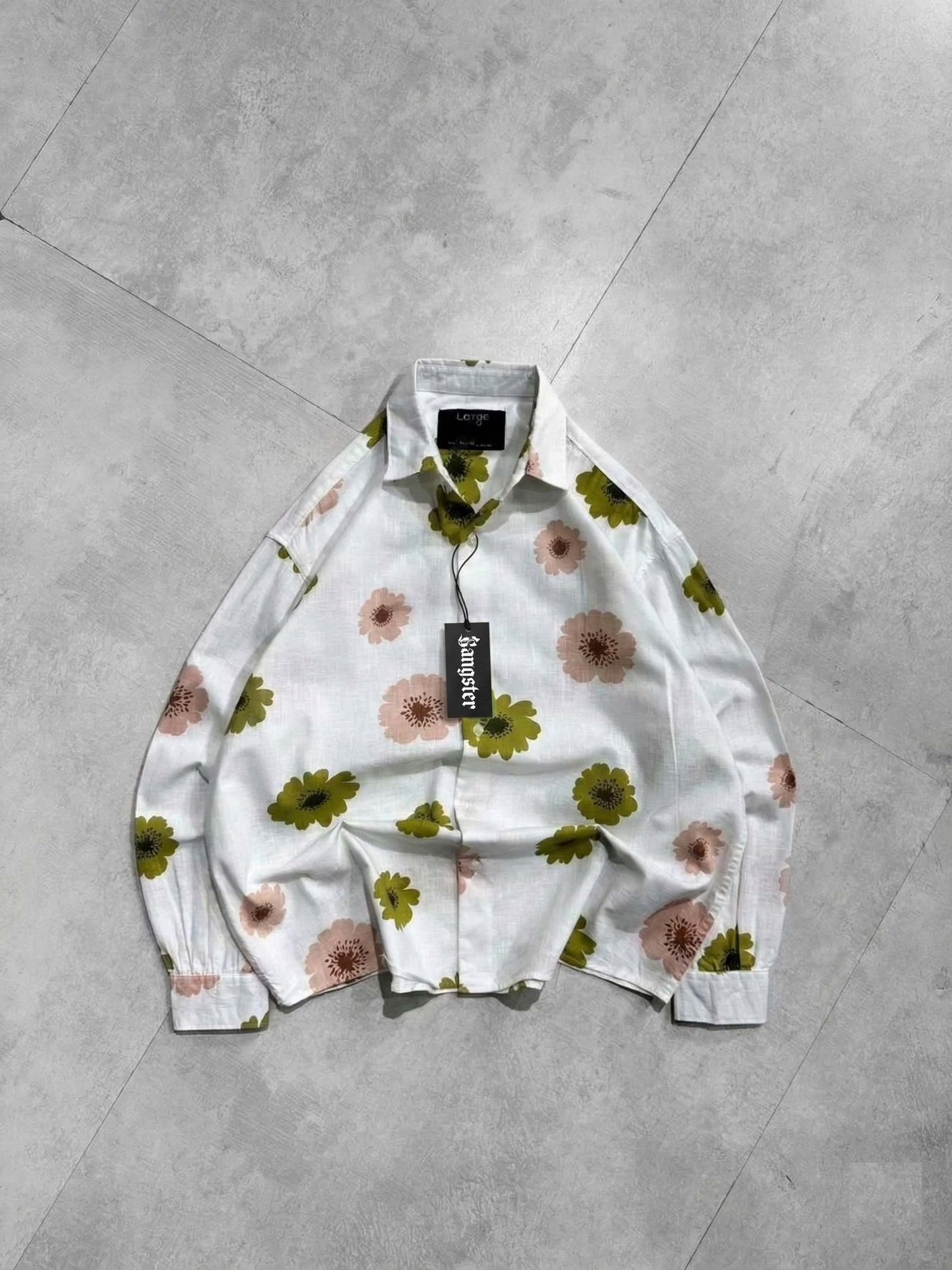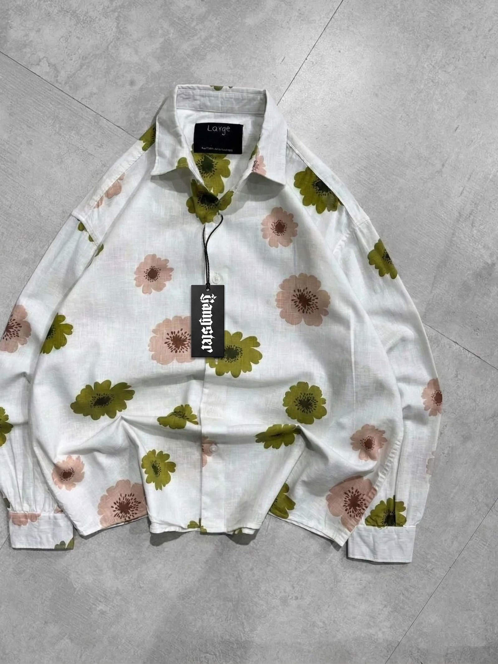 - Shop the Burnt Orange & Lavender Wildflower Oversize Print Shirt, A relaxed white button-down featuring a vintage burnt orange and lavender floral print. Perfect for summer & vacation style.