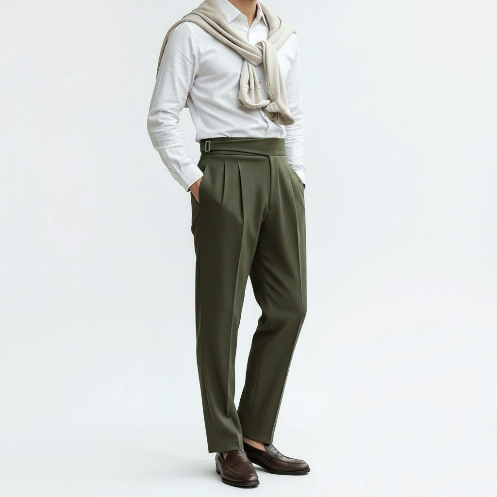 Green Italian Style Formal Gurkha Pants: Elevate your formal and party wear with a modern, elegant twist. Featuring the signature high-waist and double buckle closure, these trousers offer unmatched comfort and sophisticated fit for any occasion.