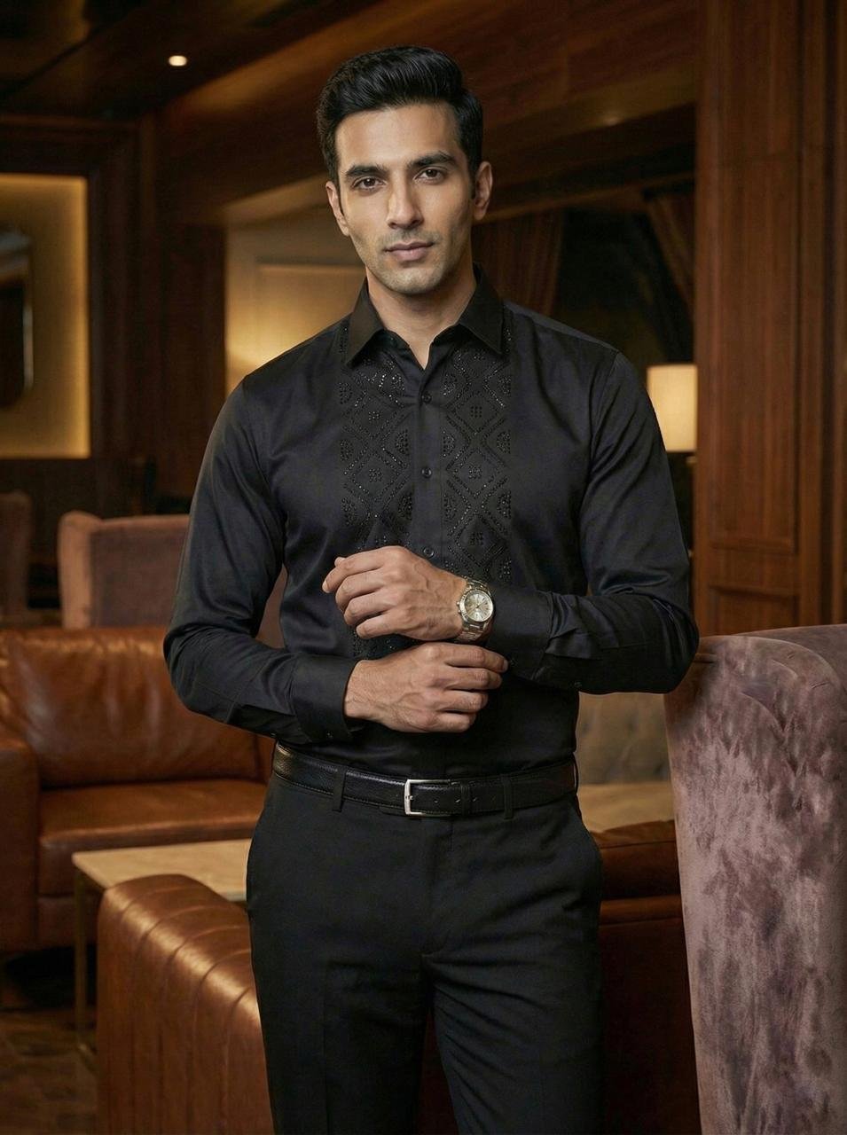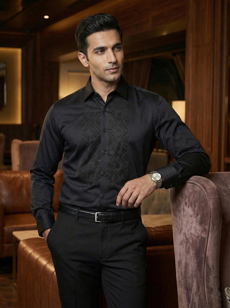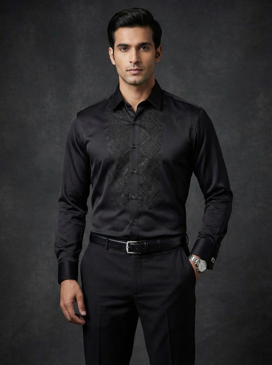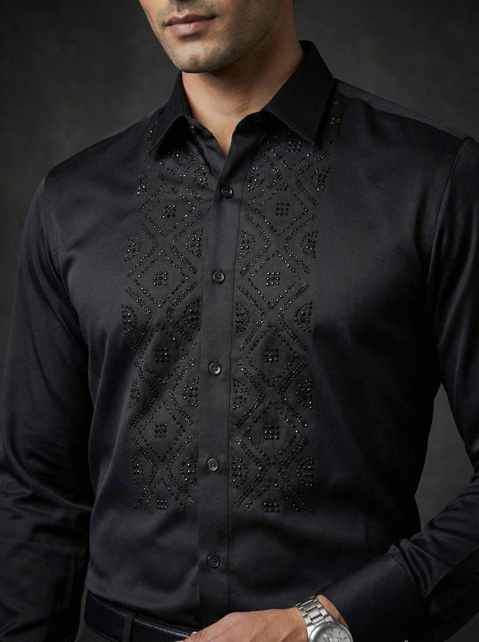 - Elevate your style with the Royal Garnet Studded Geometric Shirt, featuring a rich Black tone and subtle stud embellishments for a bold, premium look.