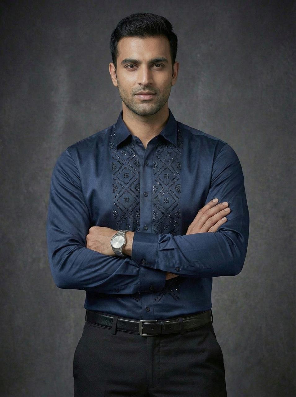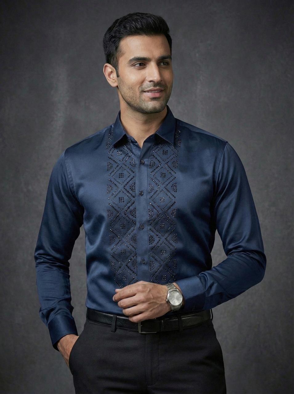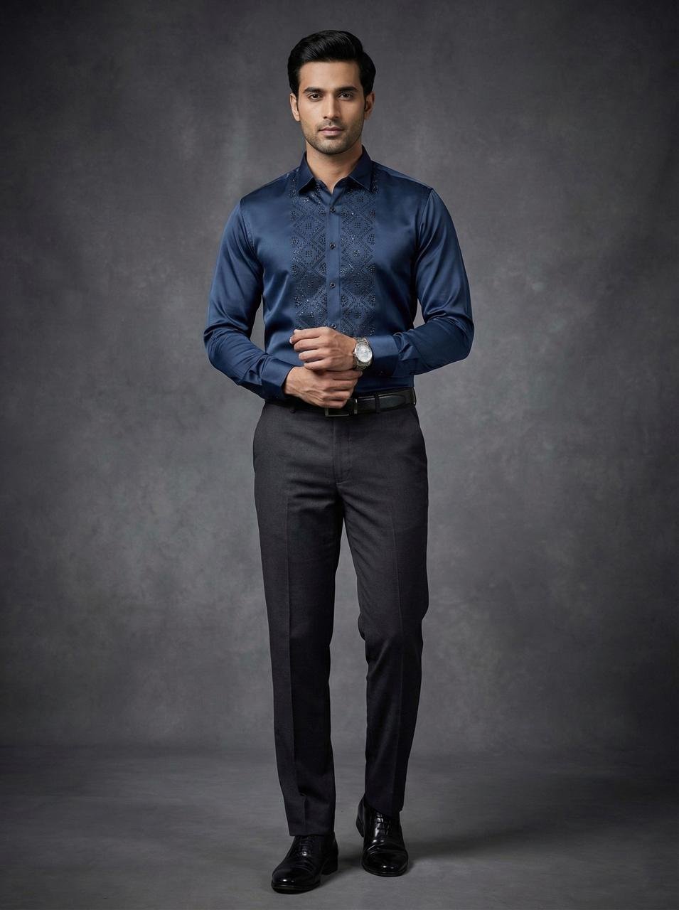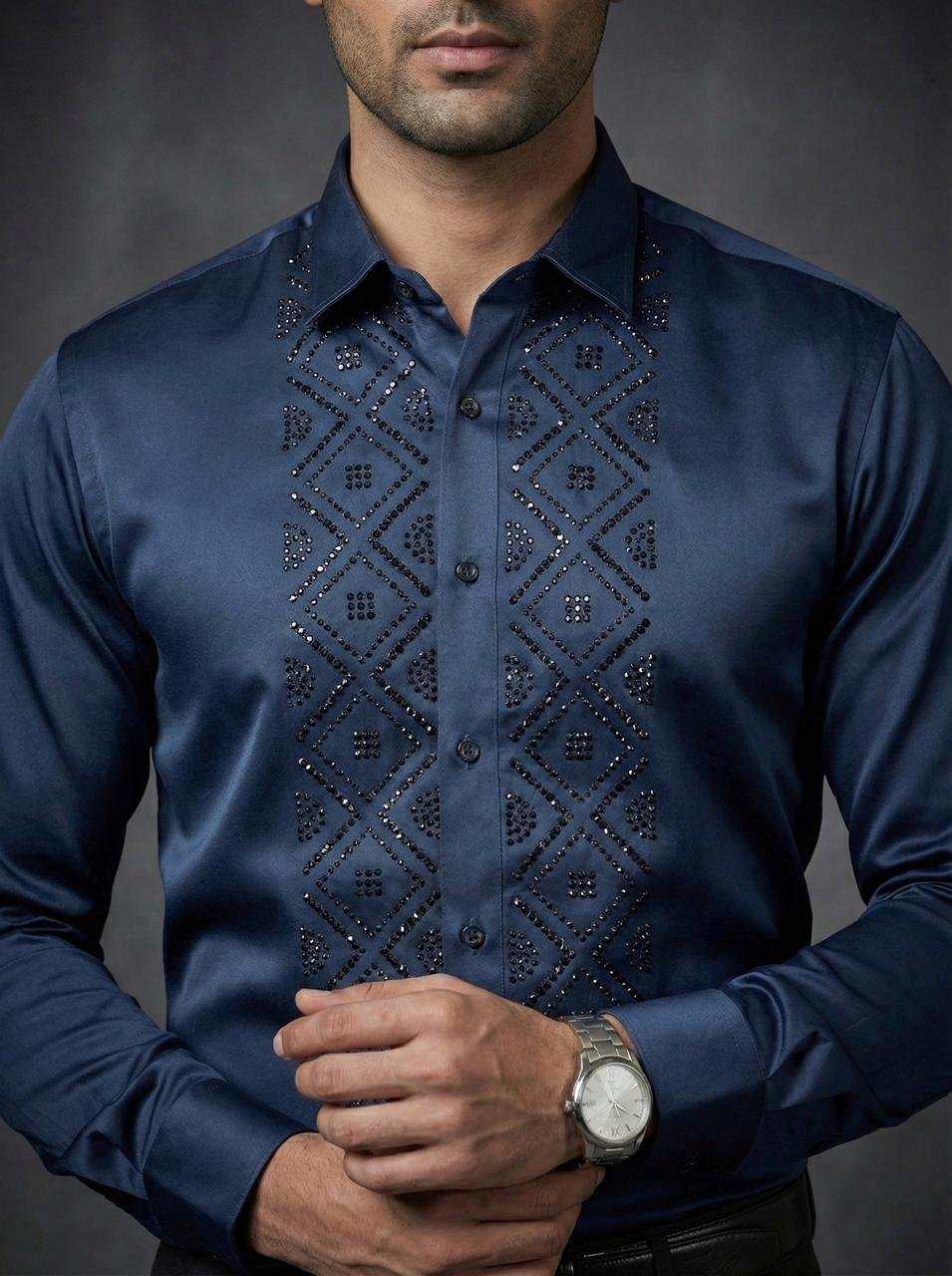 - Elevate your style with the Royal Garnet Studded Geometric Shirt, featuring a rich Blue tone and subtle stud embellishments for a bold, premium look.