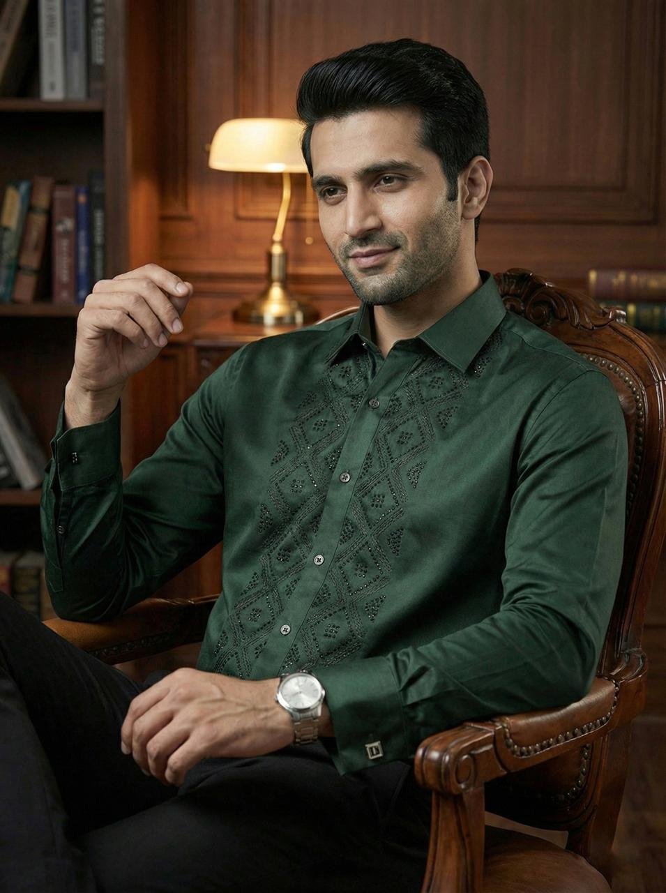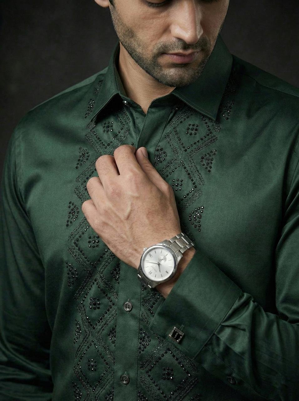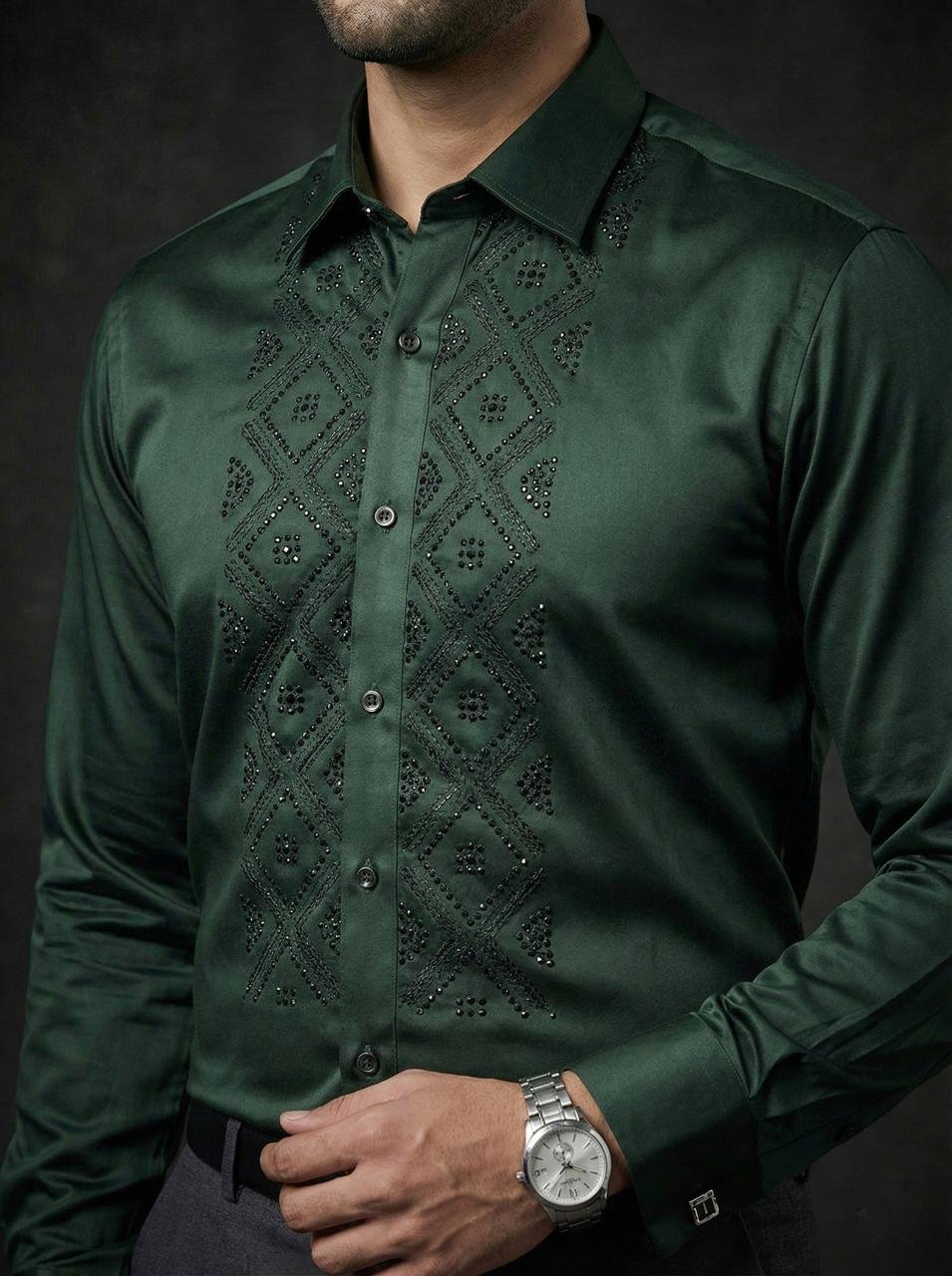 - Elevate your style with the Royal Garnet Studded Geometric Shirt, featuring a rich Green tone and subtle stud embellishments for a bold, premium look.