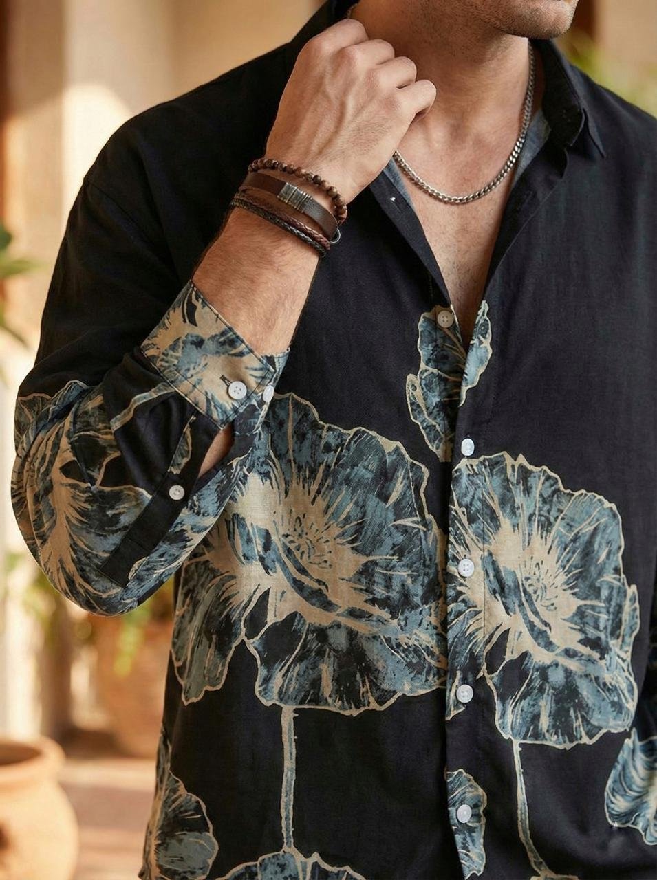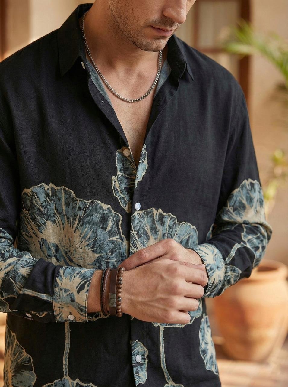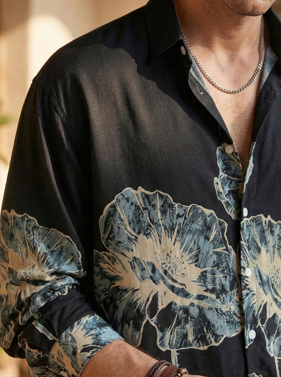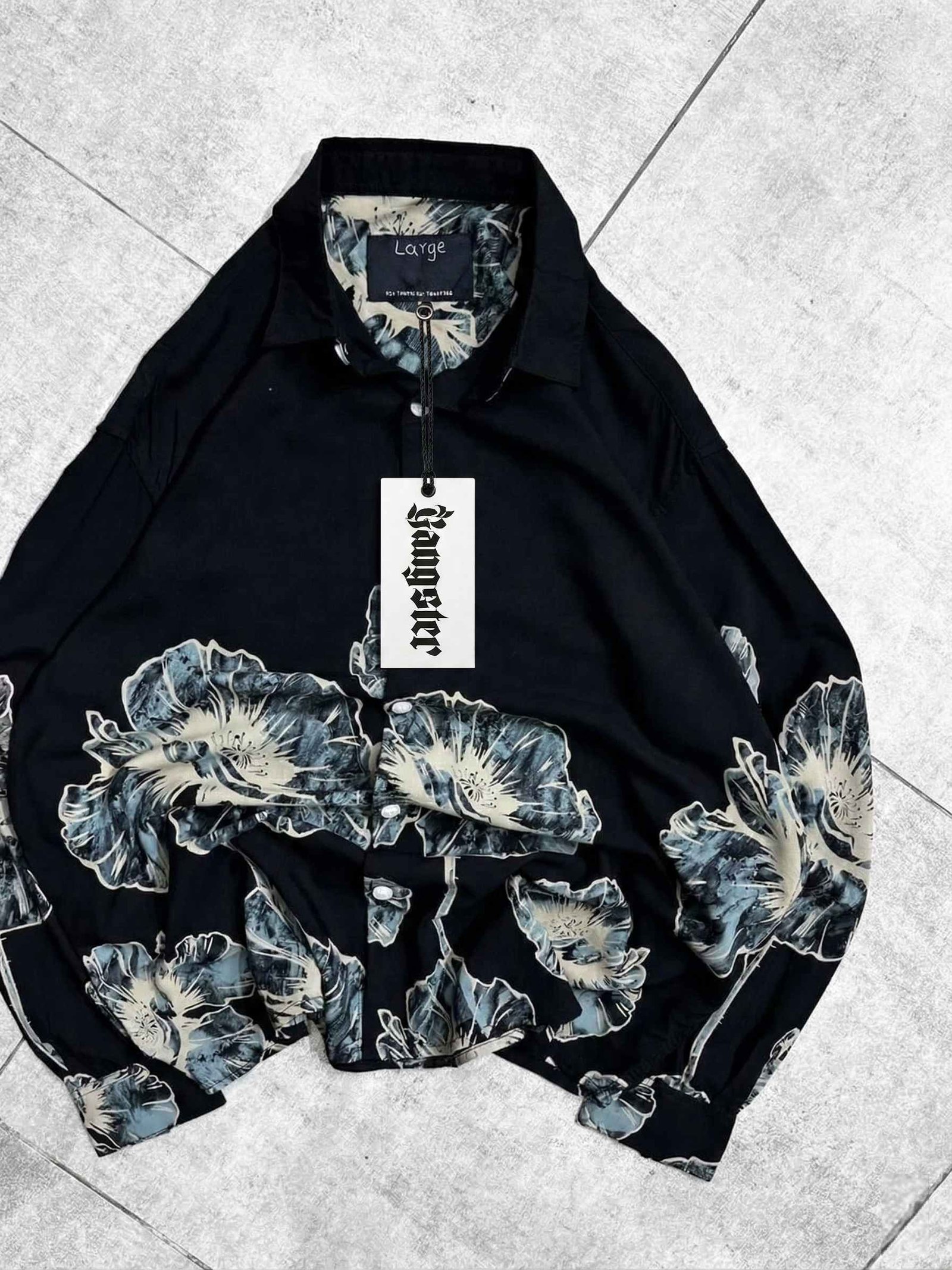 - Black oversized shirt with bold floral print. Soft Blue Rayon fabric, relaxed dropshoulder fit—perfect for modern streetwear and casual styling.
