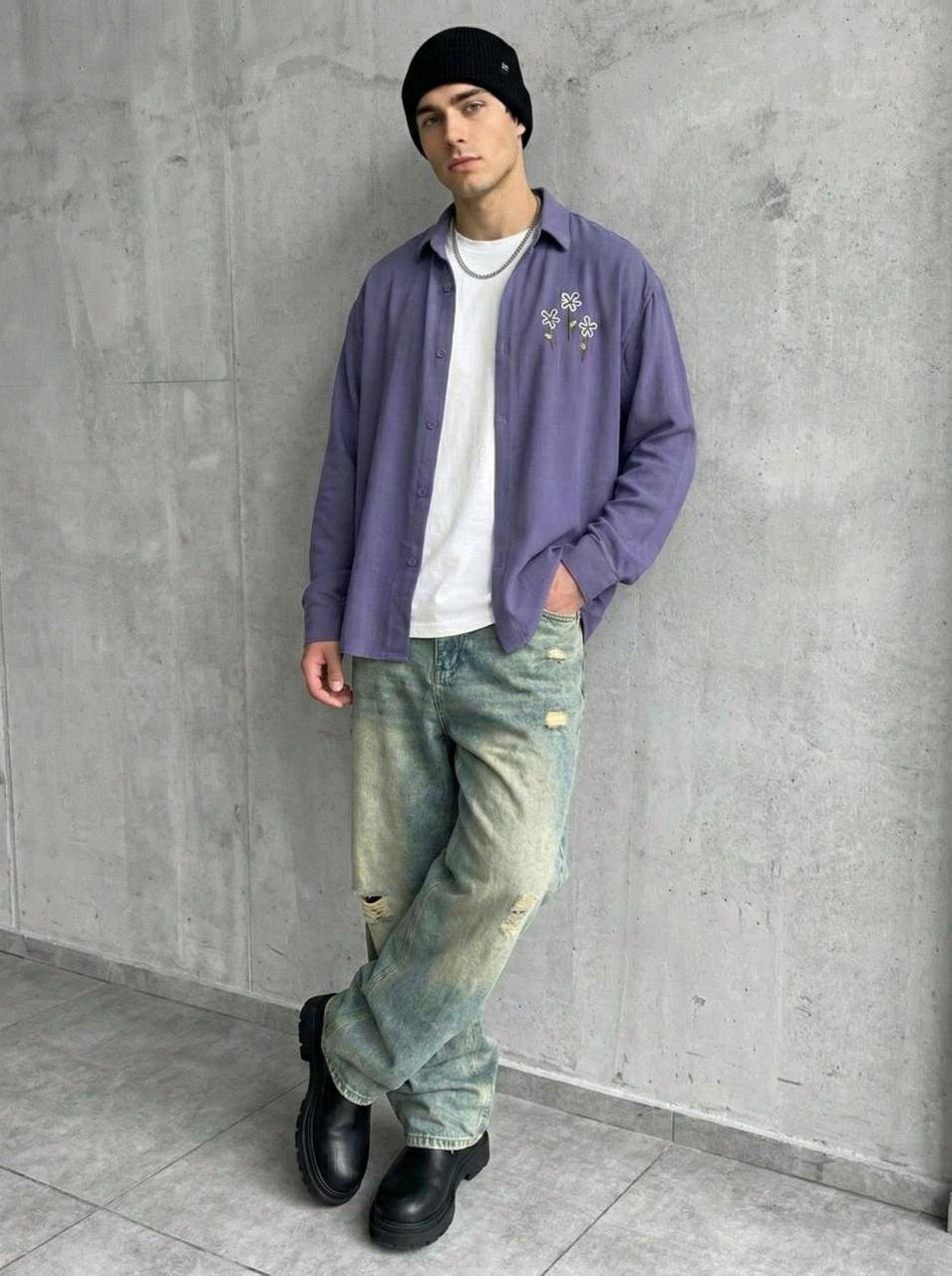 “Elevate your casual wardrobe with this beige long-sleeve button-down shirt. Featuring delicate white floral embroidery on the chest and a soft, relaxed drape, this trendy piece blends modern streetwear aesthetics with effortless comfort.”