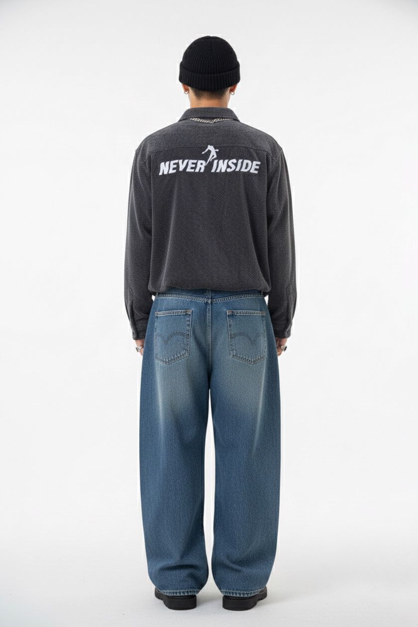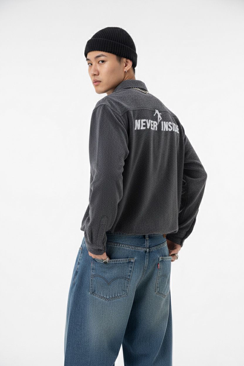 Back Details: The back of the shirt features prominent white graphic lettering that says “NEVER INSIDE,” with a small silhouette of a person in a dynamic pose above the text. This suggests the shirt may be part of a streetwear or sportswear line.
