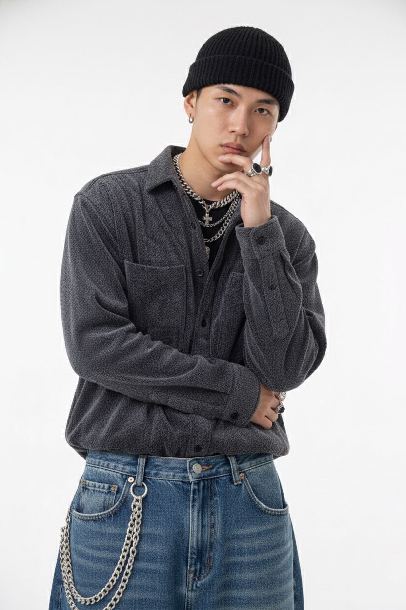 Pockets: There are two large chest pockets with flaps, adding a utility or workwear element to the design.