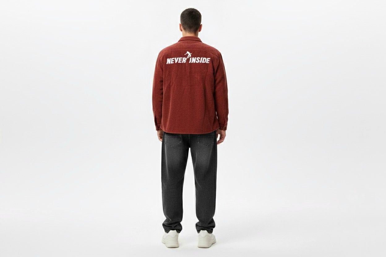 Back Details: The back of the shirt features prominent white graphic lettering that says “NEVER INSIDE,” with a small silhouette of a person in a dynamic pose above the text. This suggests the shirt may be part of a streetwear or sportswear line.