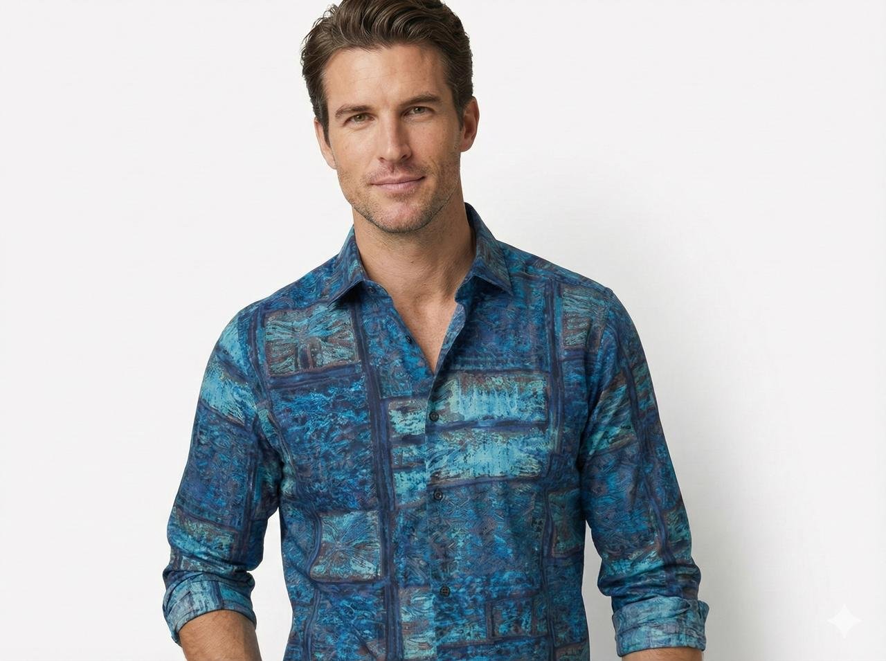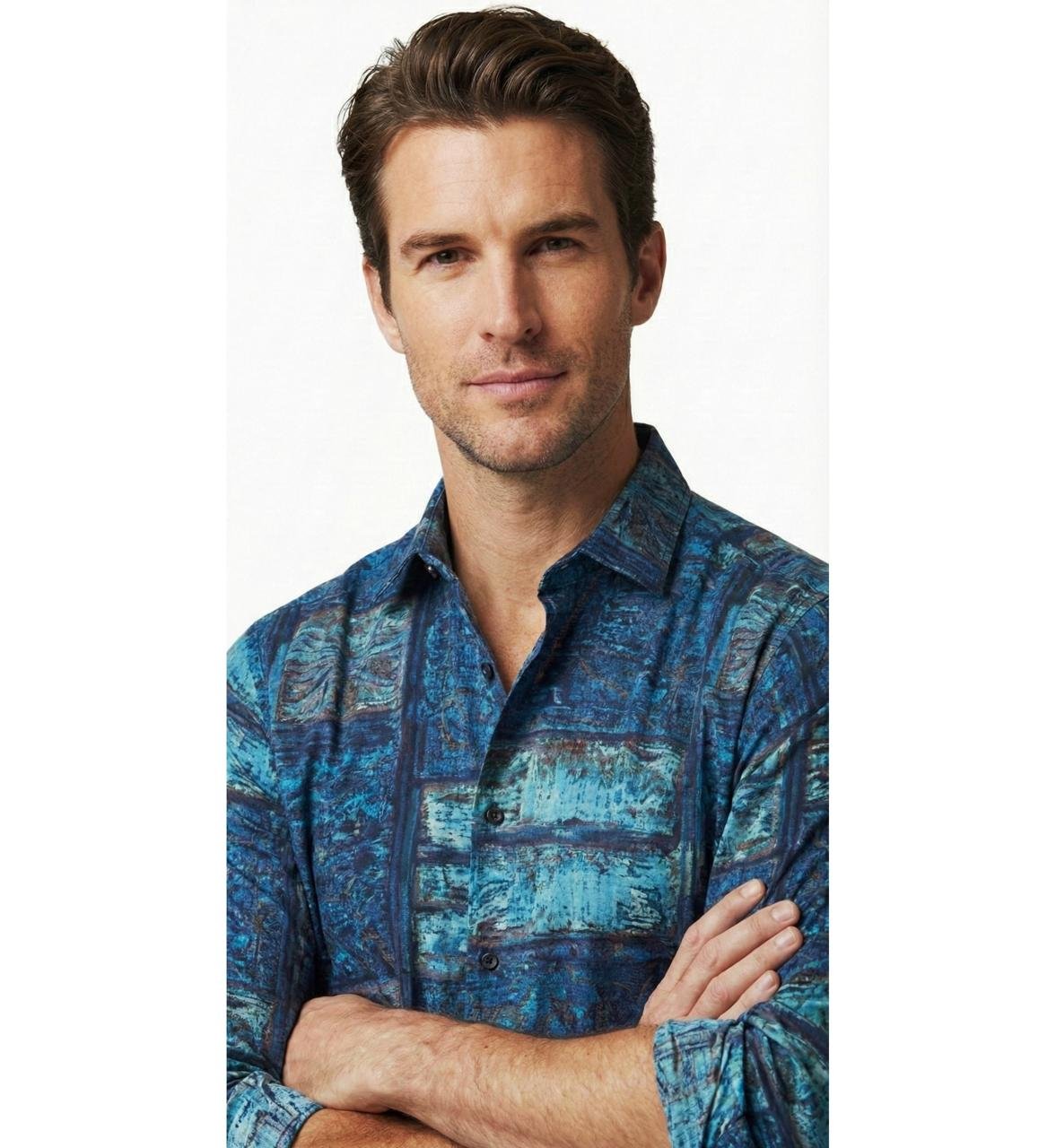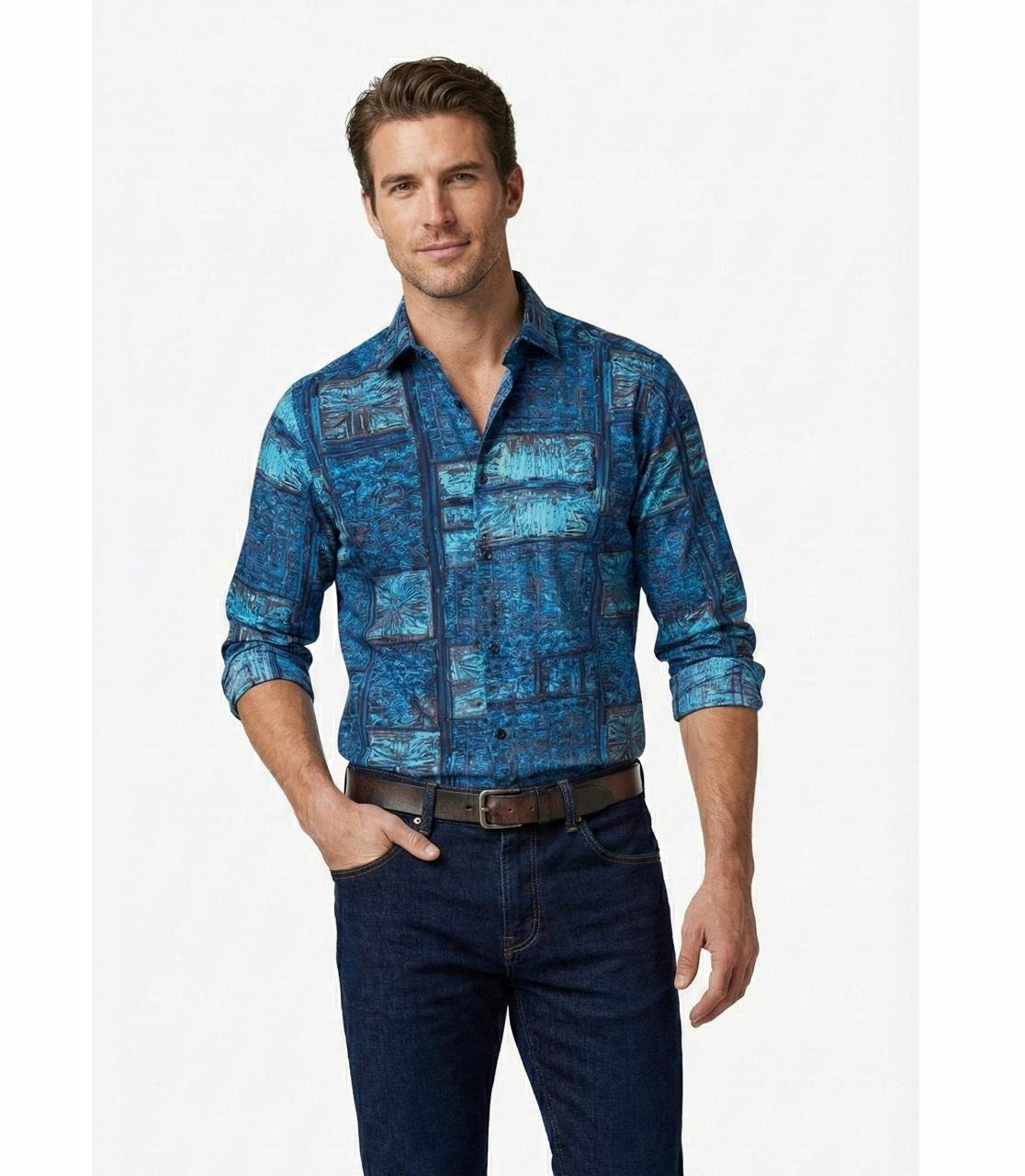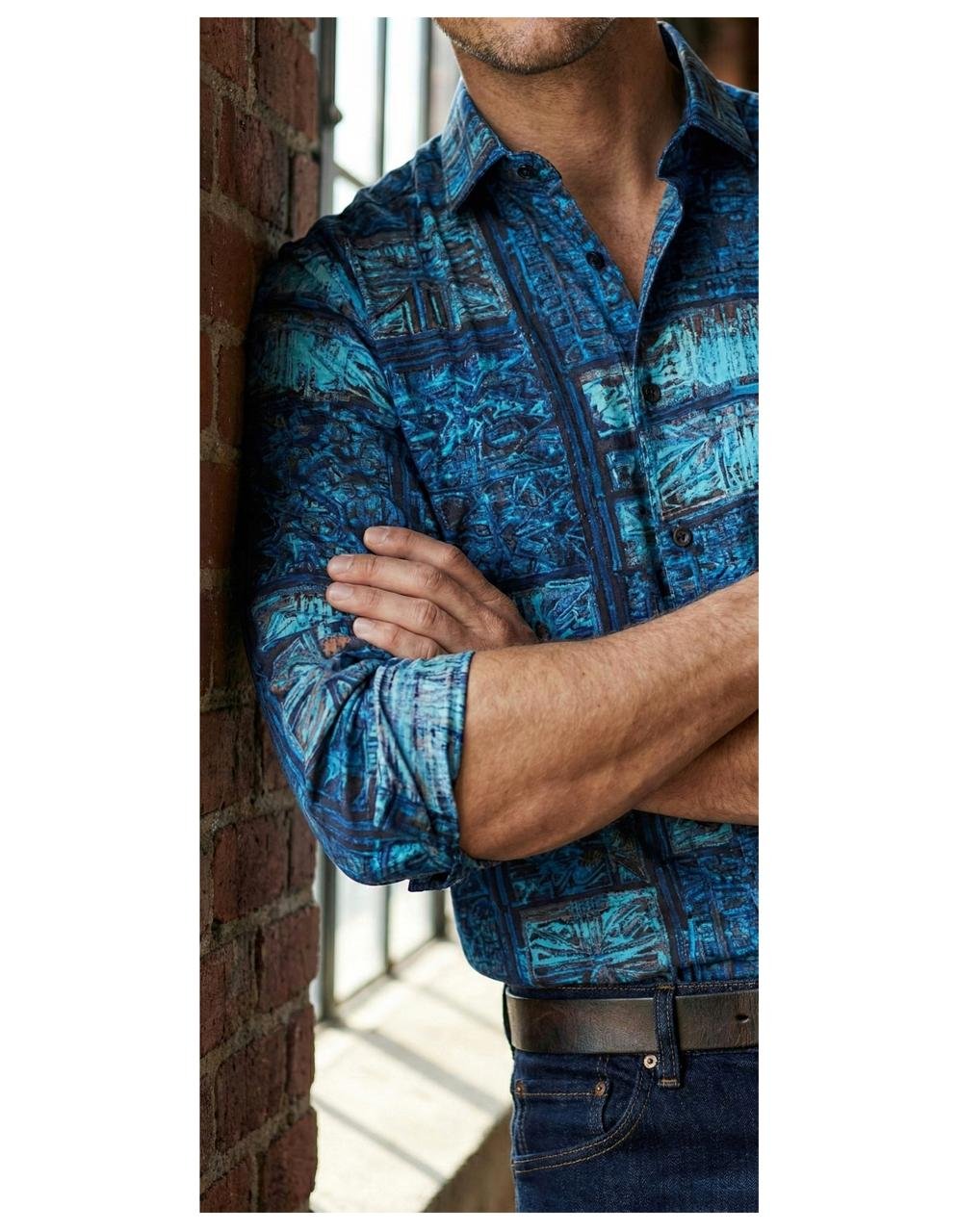 Art meets ease in this slim-fit shirt crafted from soft, breathable viscose-rayon. Featuring an all-over abstract print in earthy tones, it’s a statement piece that stays lightweight and refined. No pockets. No clutter. Just bold expression.