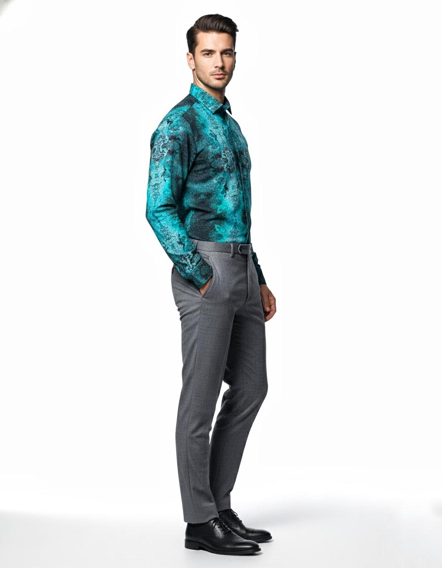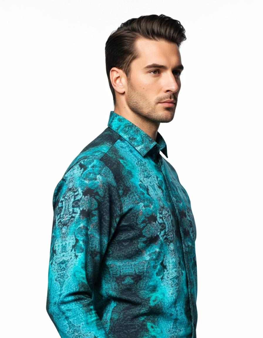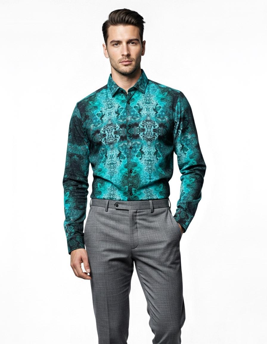 Art meets ease in this slim-fit shirt crafted from soft, breathable viscose-rayon. Featuring an all-over abstract print in earthy tones, it’s a statement piece that stays lightweight and refined. No pockets. No clutter. Just bold expression.