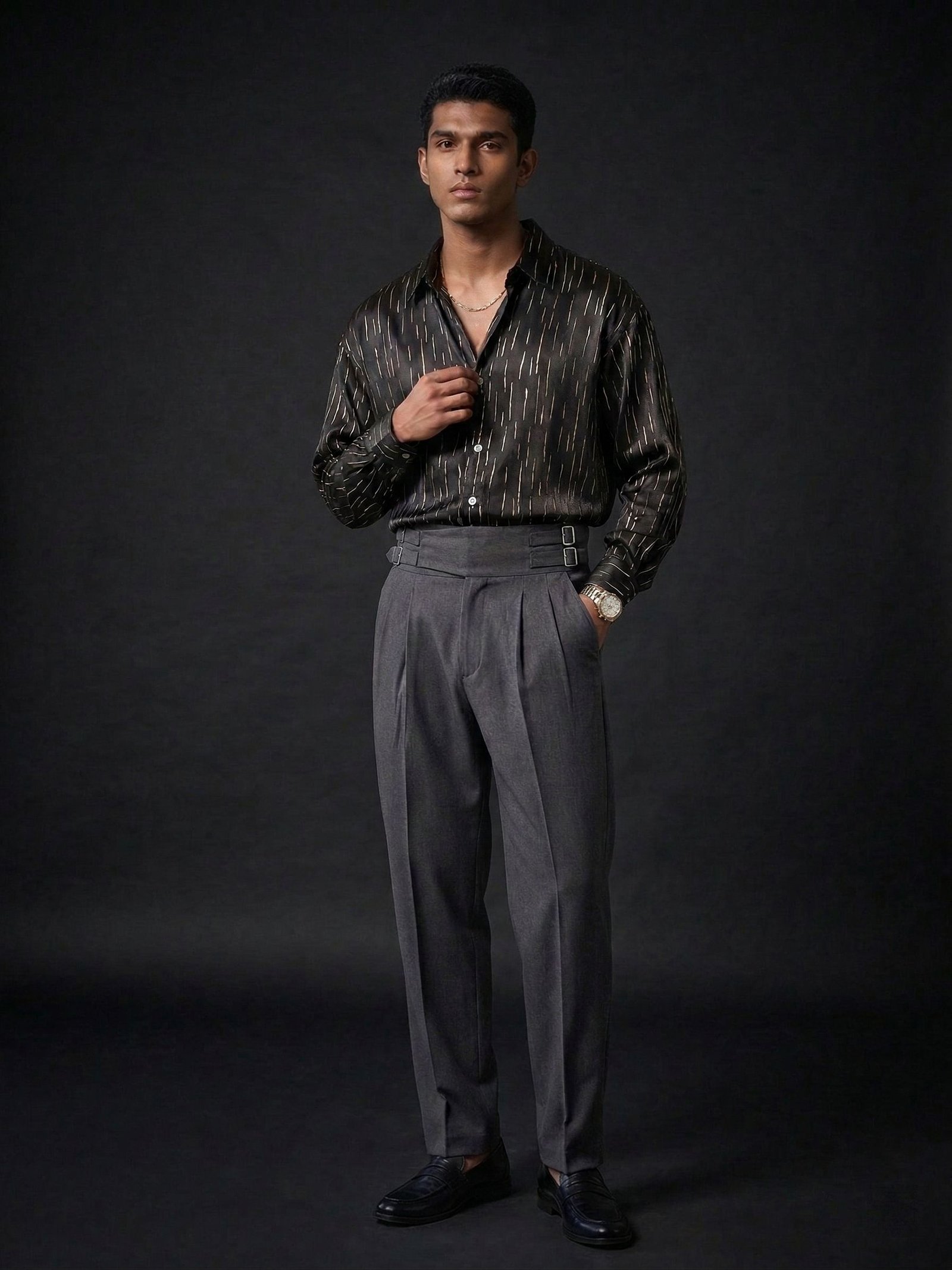 Pair it with black jeans, chinos, or layered over a tee for a bold contemporary look.