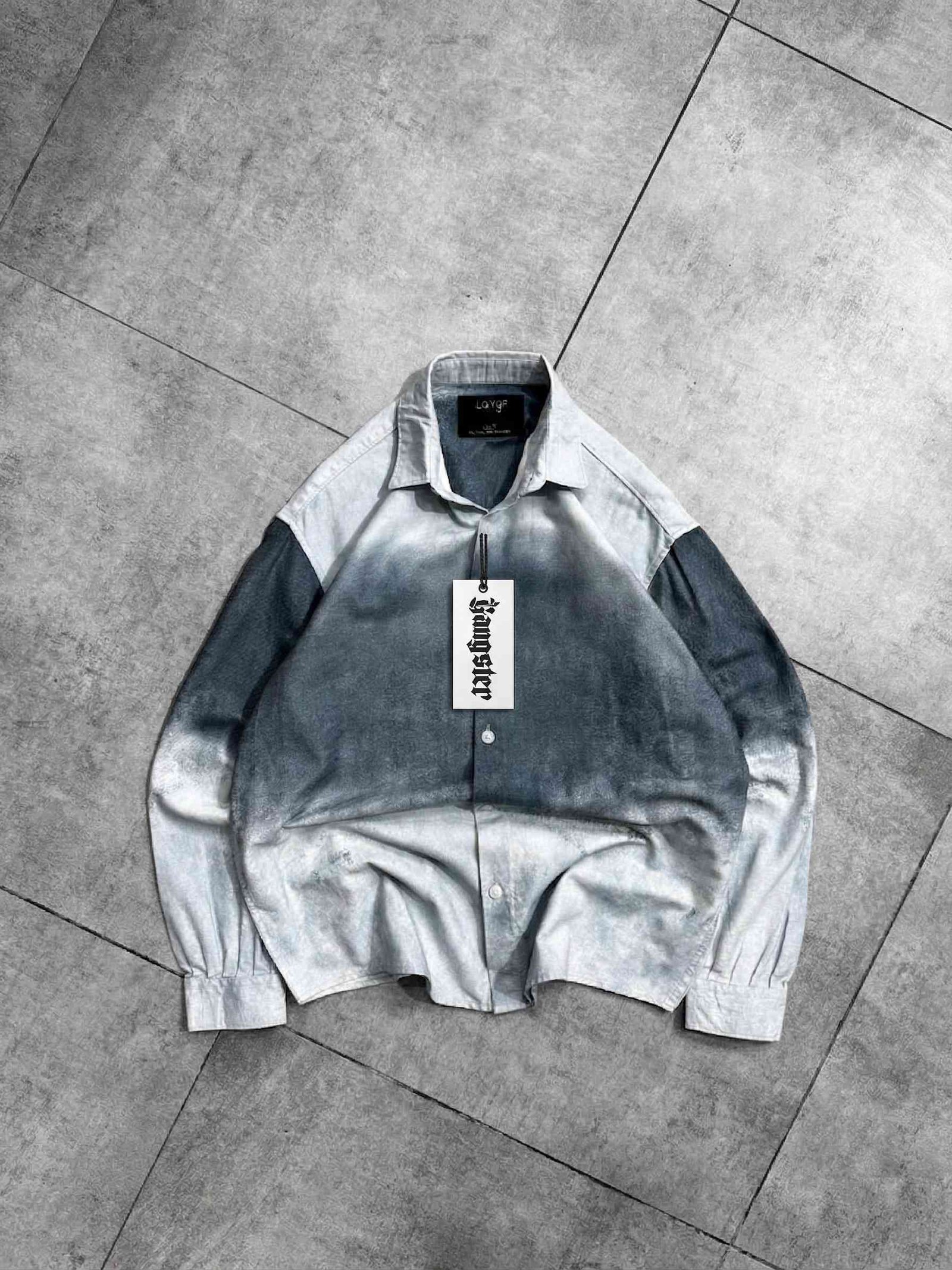 Soft Fade Luxe Shirt — A relaxed-fit button-up crafted from lightweight, breathable fabric. Showcases a smooth grey gradient fade on a soft off-white base, delivering a refined, minimal look with a modern streetwear edge.