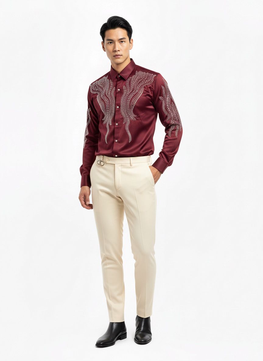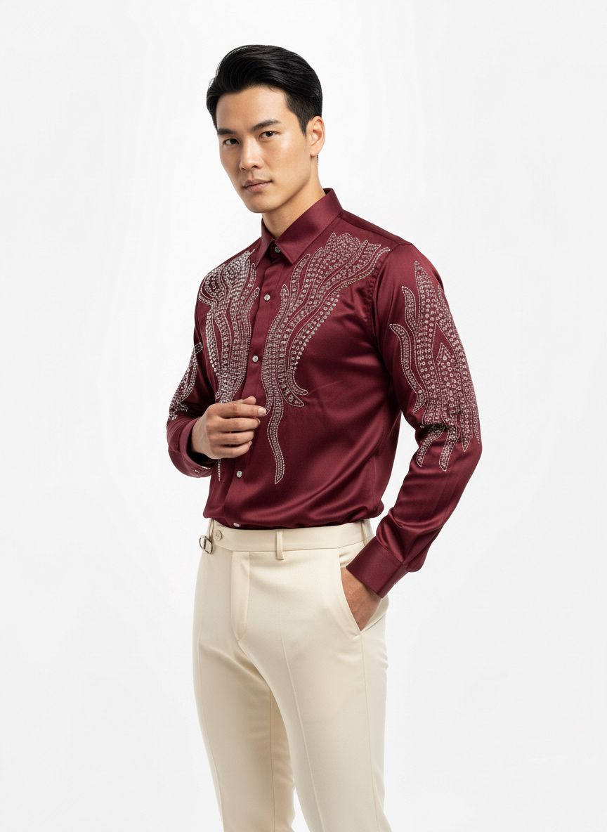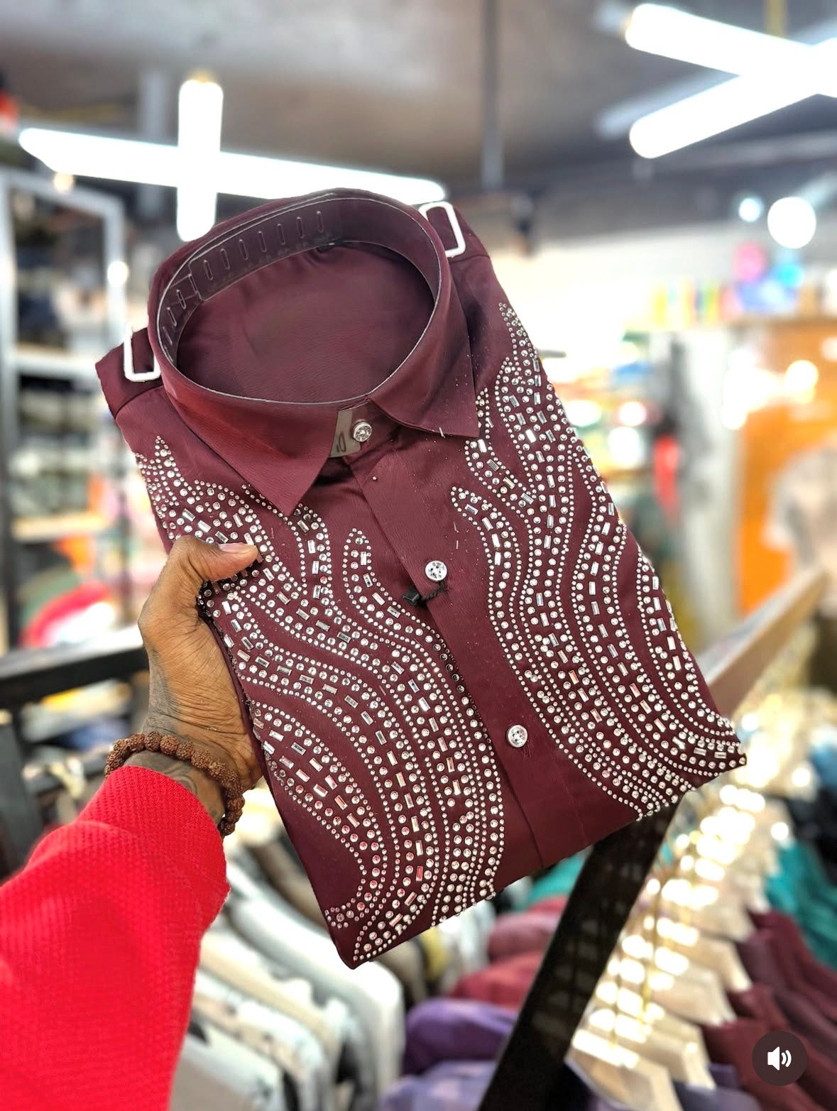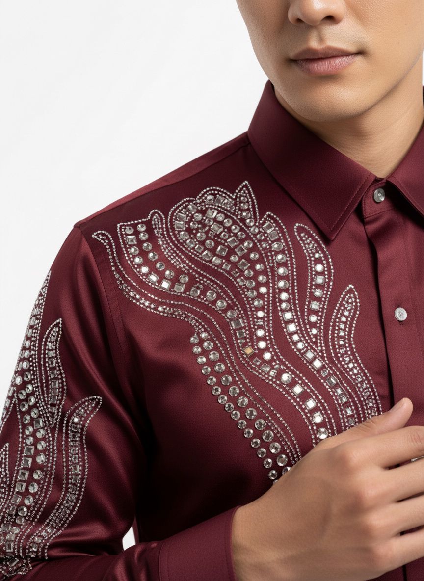 “Stone Designer Shirt” in a rich Maroon hue, likely a deep navy or a similar elegant shade. The shirt’s fabric appears smooth and luxurious satin giving it a subtle sheen that enhances its sophisticated look.