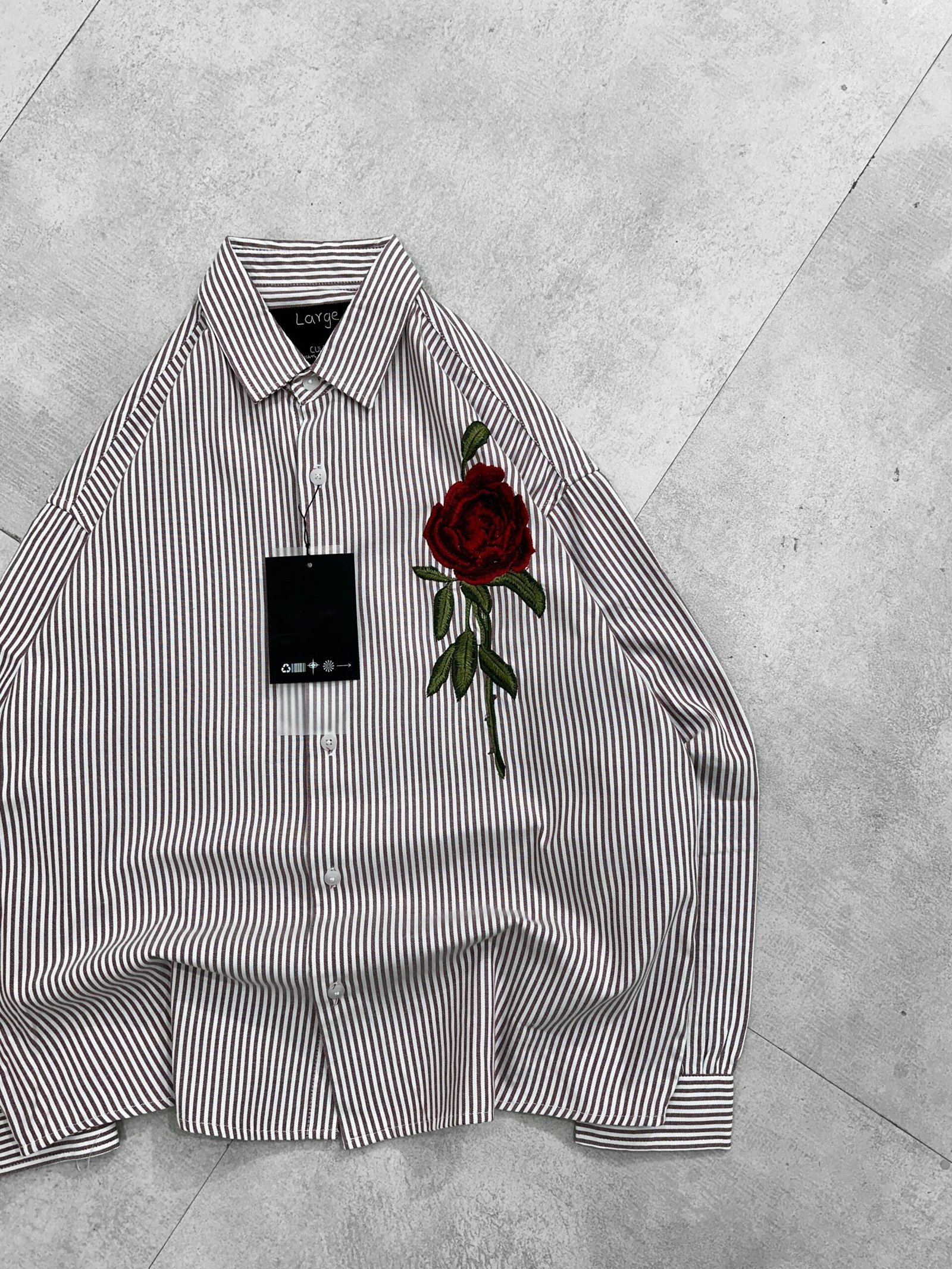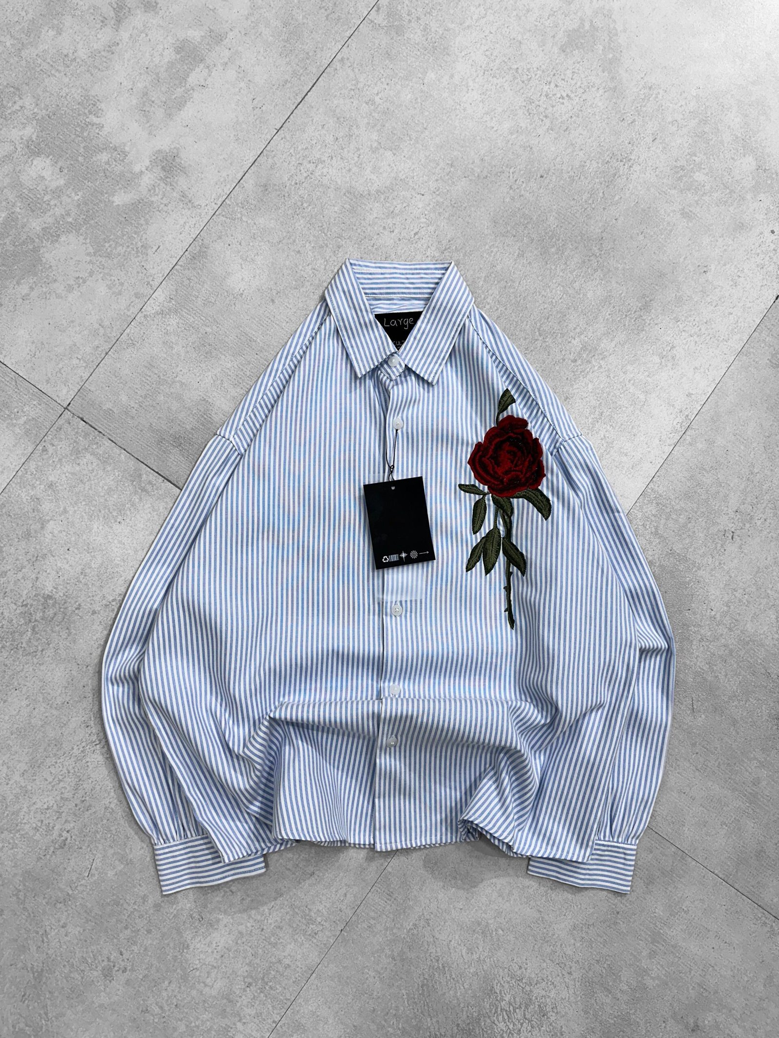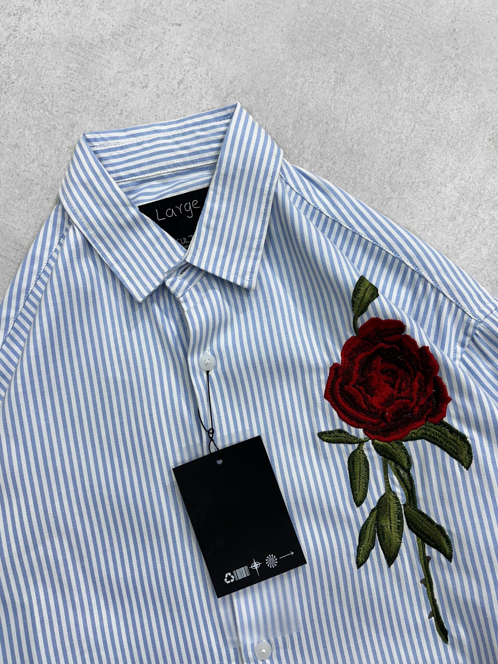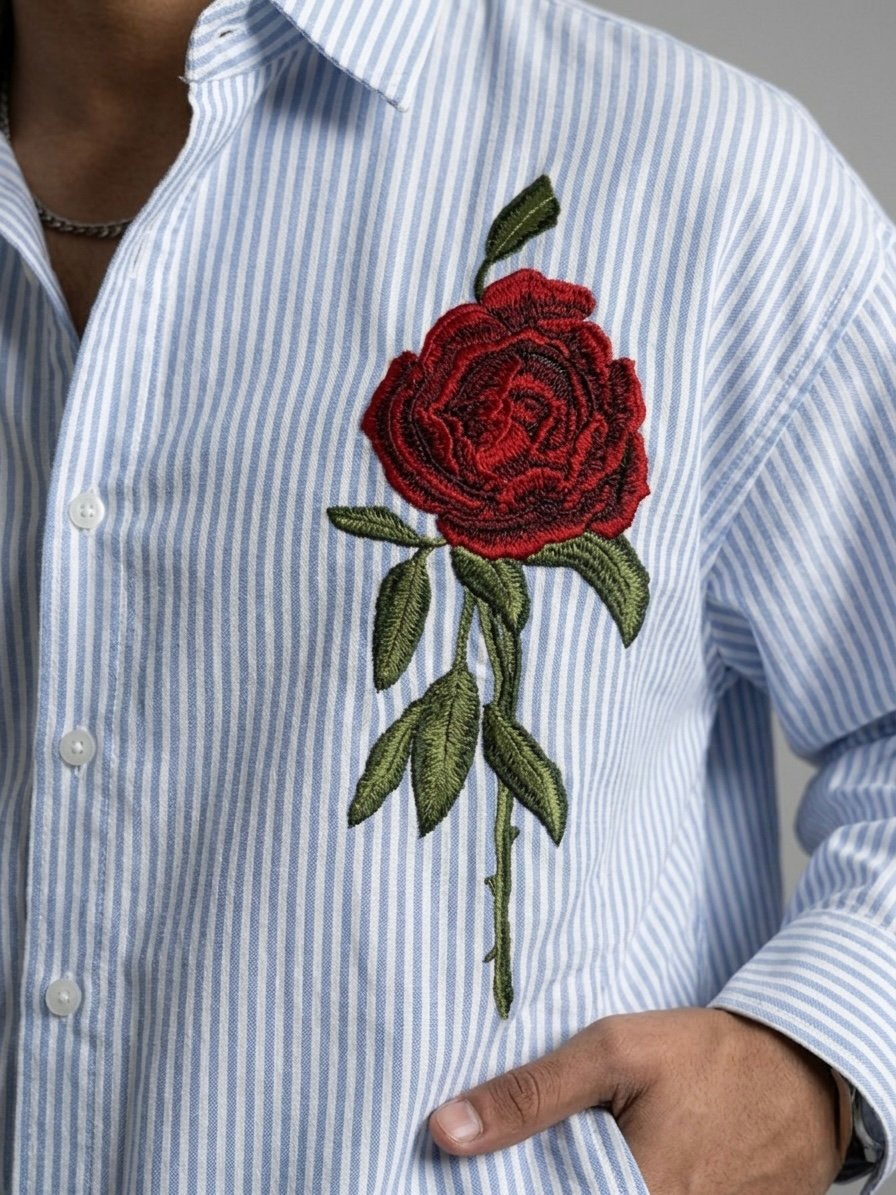 Elevate your everyday wardrobe with the Lavge Rose Embroidered Striped Shirt. Featuring a classic blue and white vertical stripe pattern, this shirt is reimagined with a high-density, vibrant red rose embroidery on the chest for a bold, artistic touch.