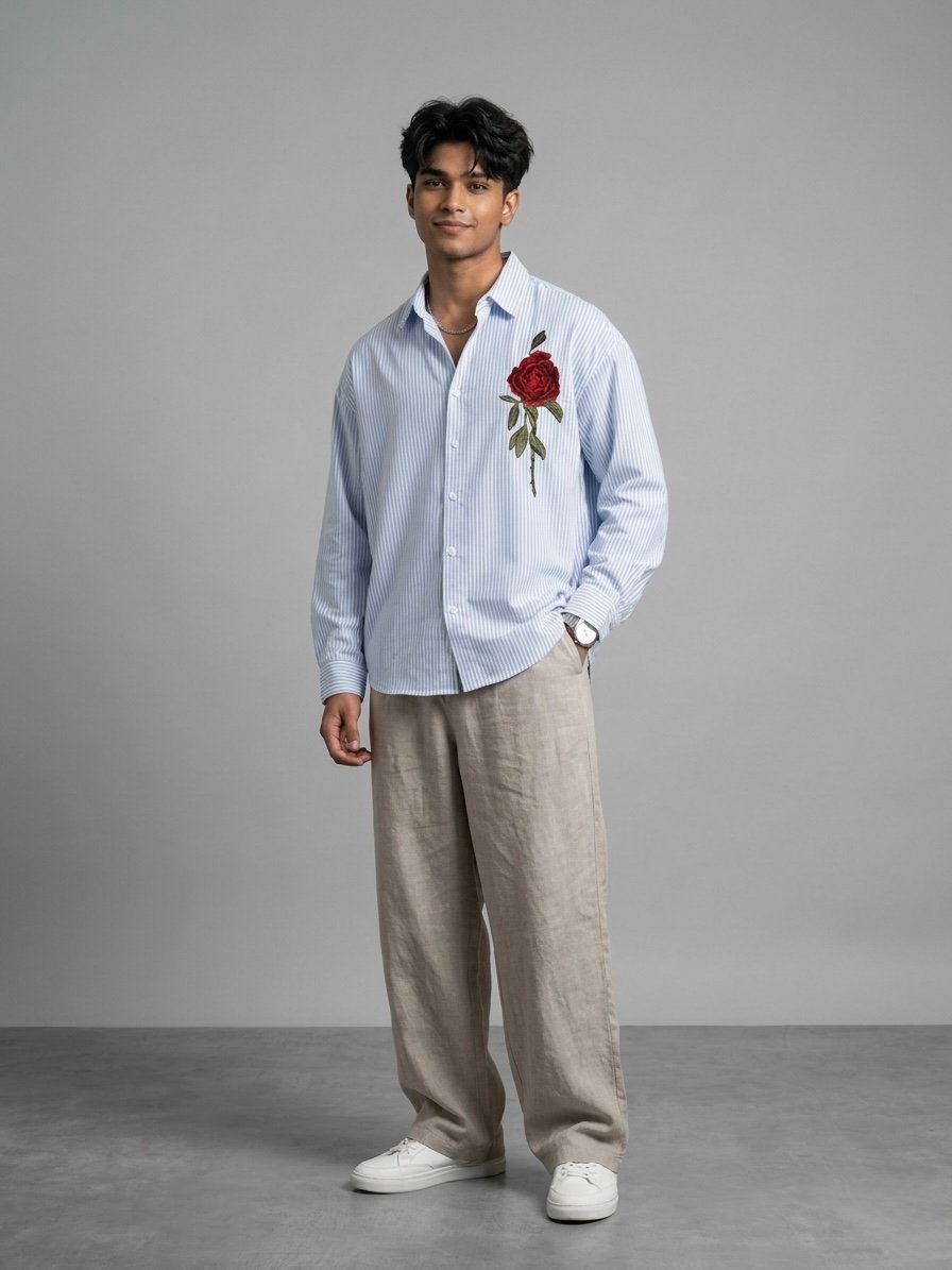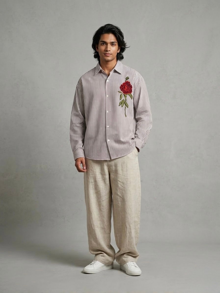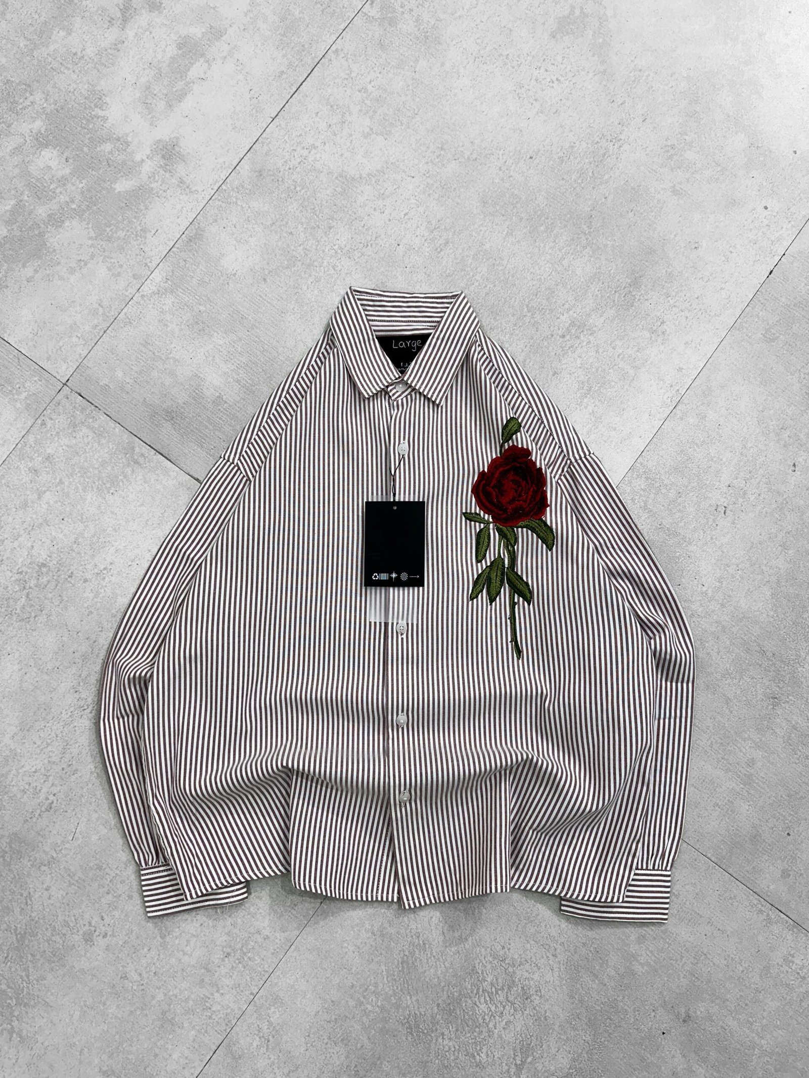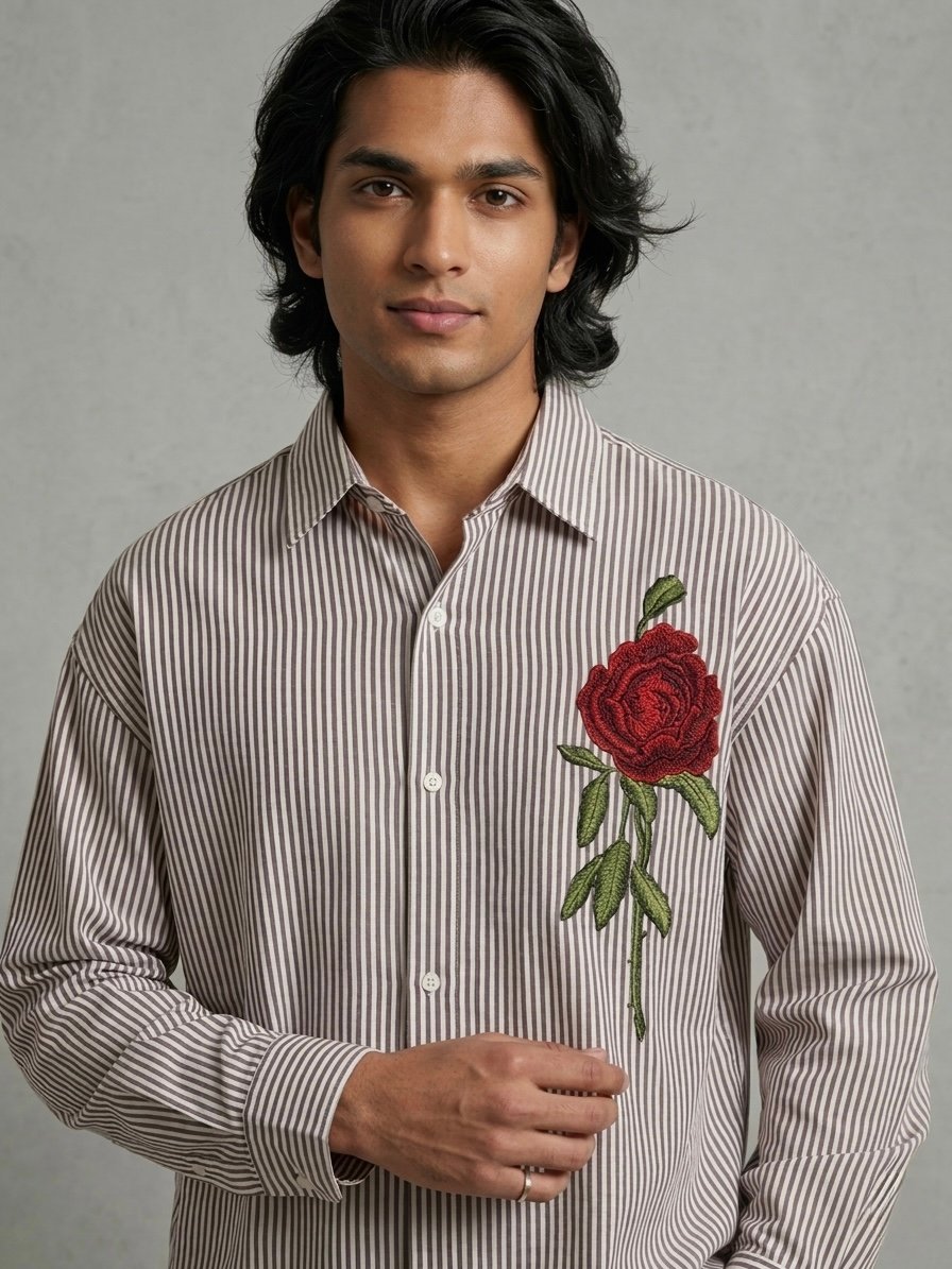 Elevate your everyday wardrobe with the Lavge Rose Embroidered Striped Shirt. Featuring a classic blue and white vertical stripe pattern, this shirt is reimagined with a high-density, vibrant red rose embroidery on the chest for a bold, artistic touch.