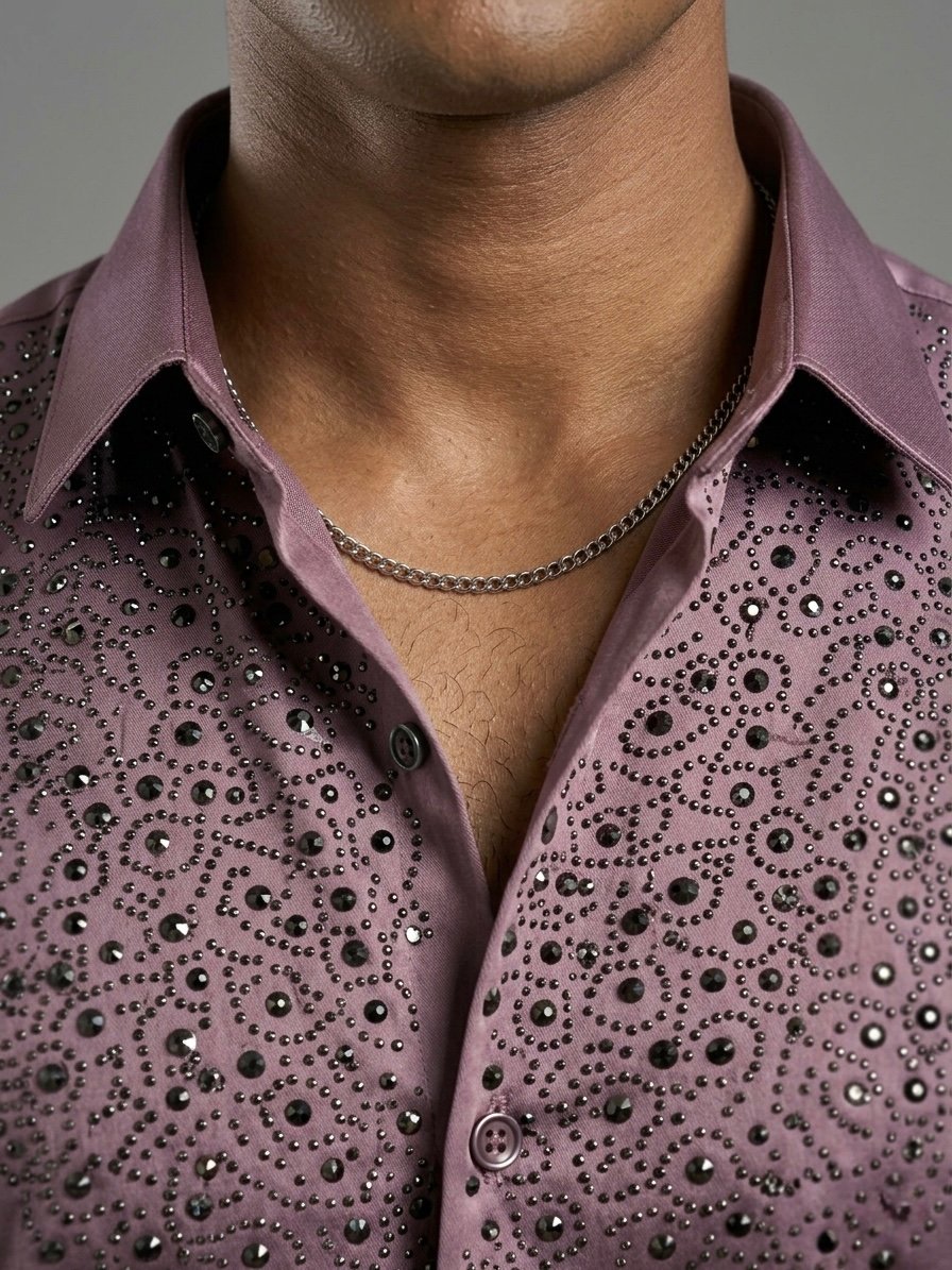 • Elevate your evening wear with this luxurious men’s satin shirt. Features a striking V-pattern Rhinestone embellishment perfect for parties and events.