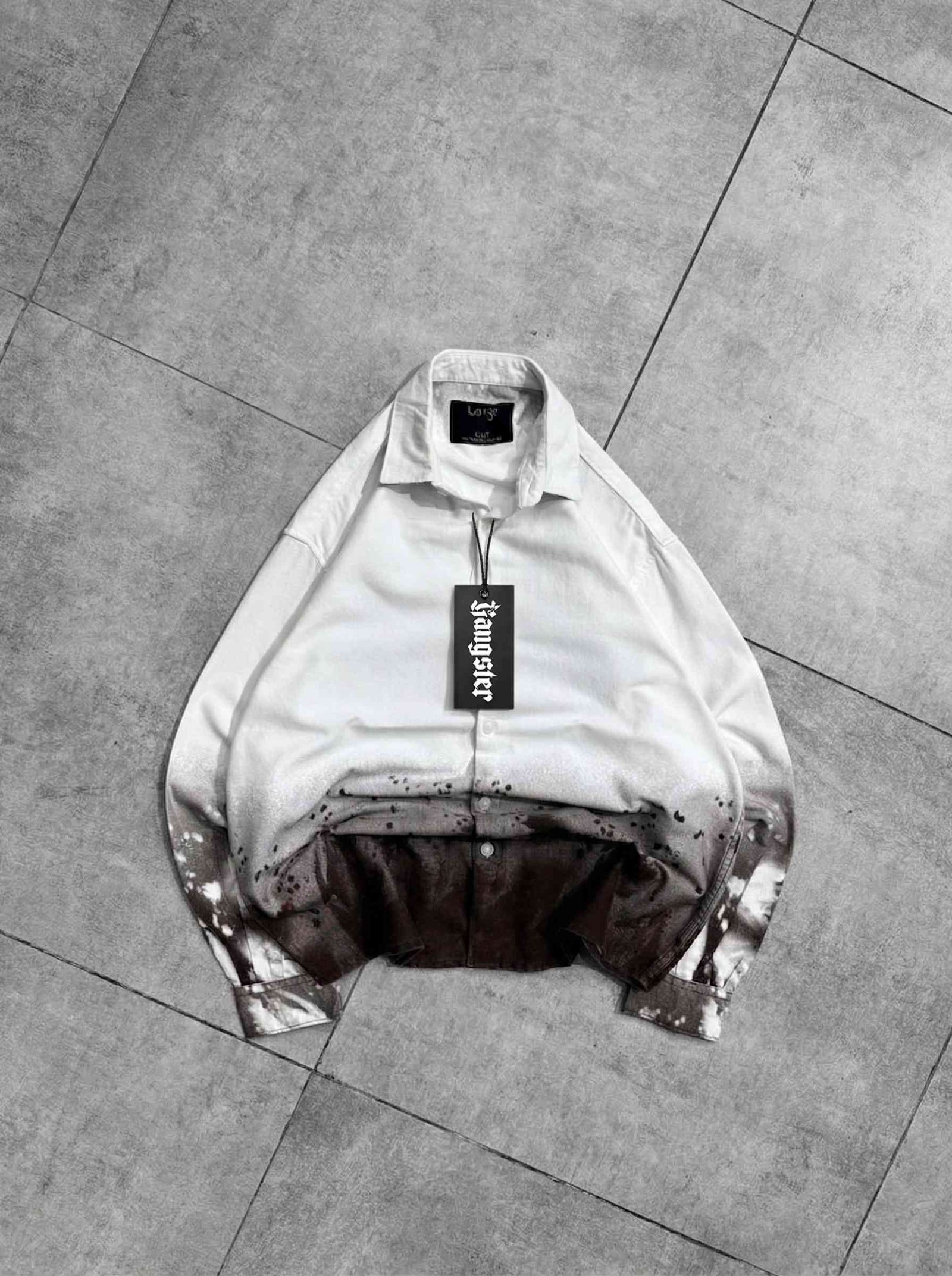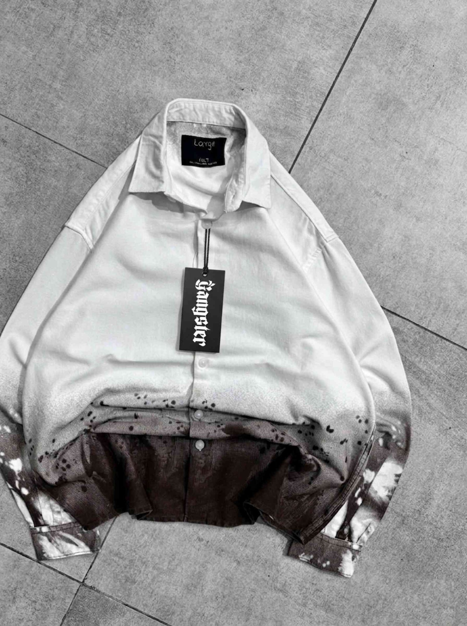 This shirt is a men’s casual button-up ombre shirt featuring a bold, streetwear-inspired design. It combines a clean upper look with an artistic lower finish, making it a standout fashion piece.