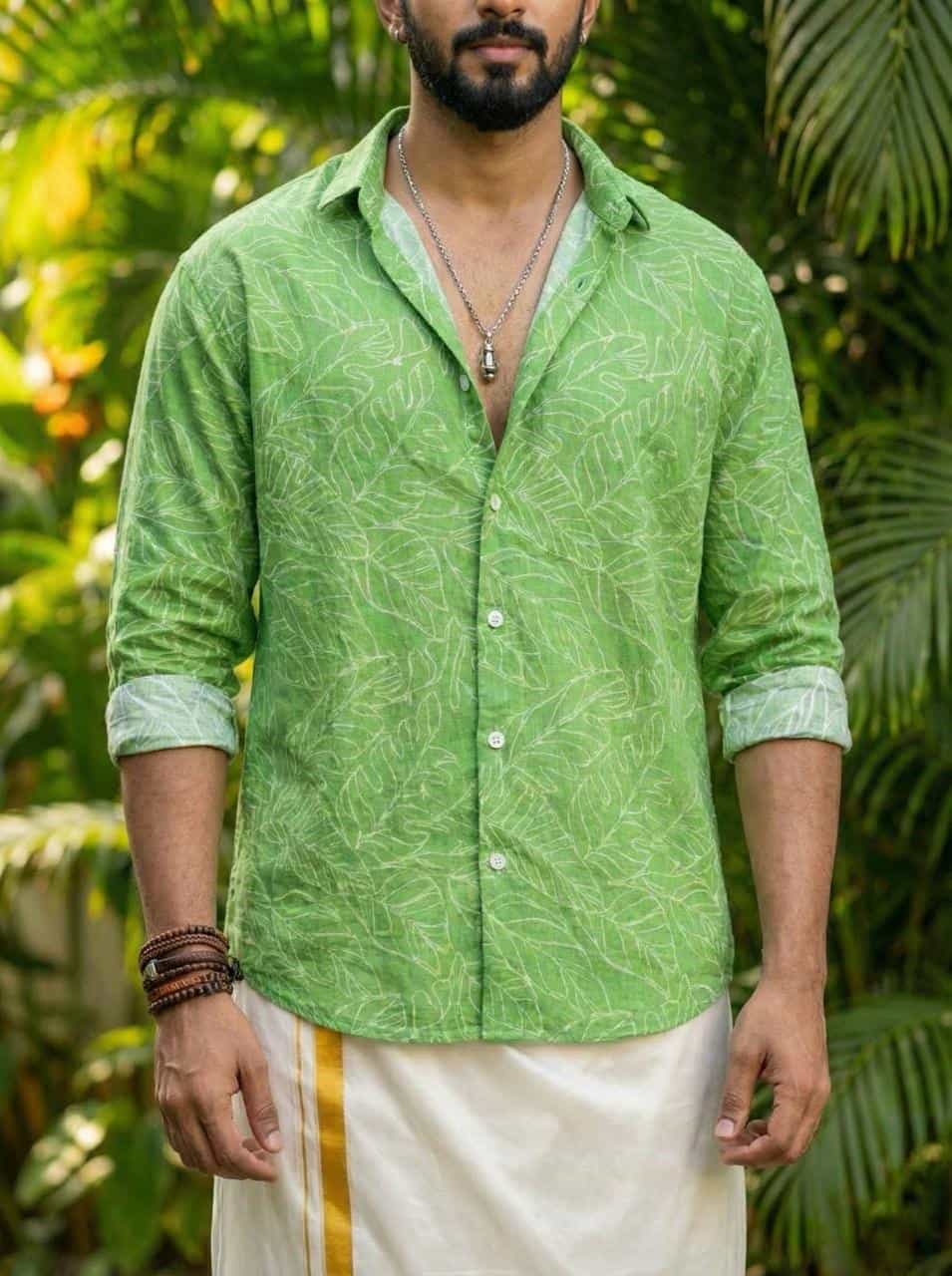 Long Sleeve. Make a statement with this Green leaf pattern button-up. Ideal for vacation outfits, parties, or casual summer looks. Size Large