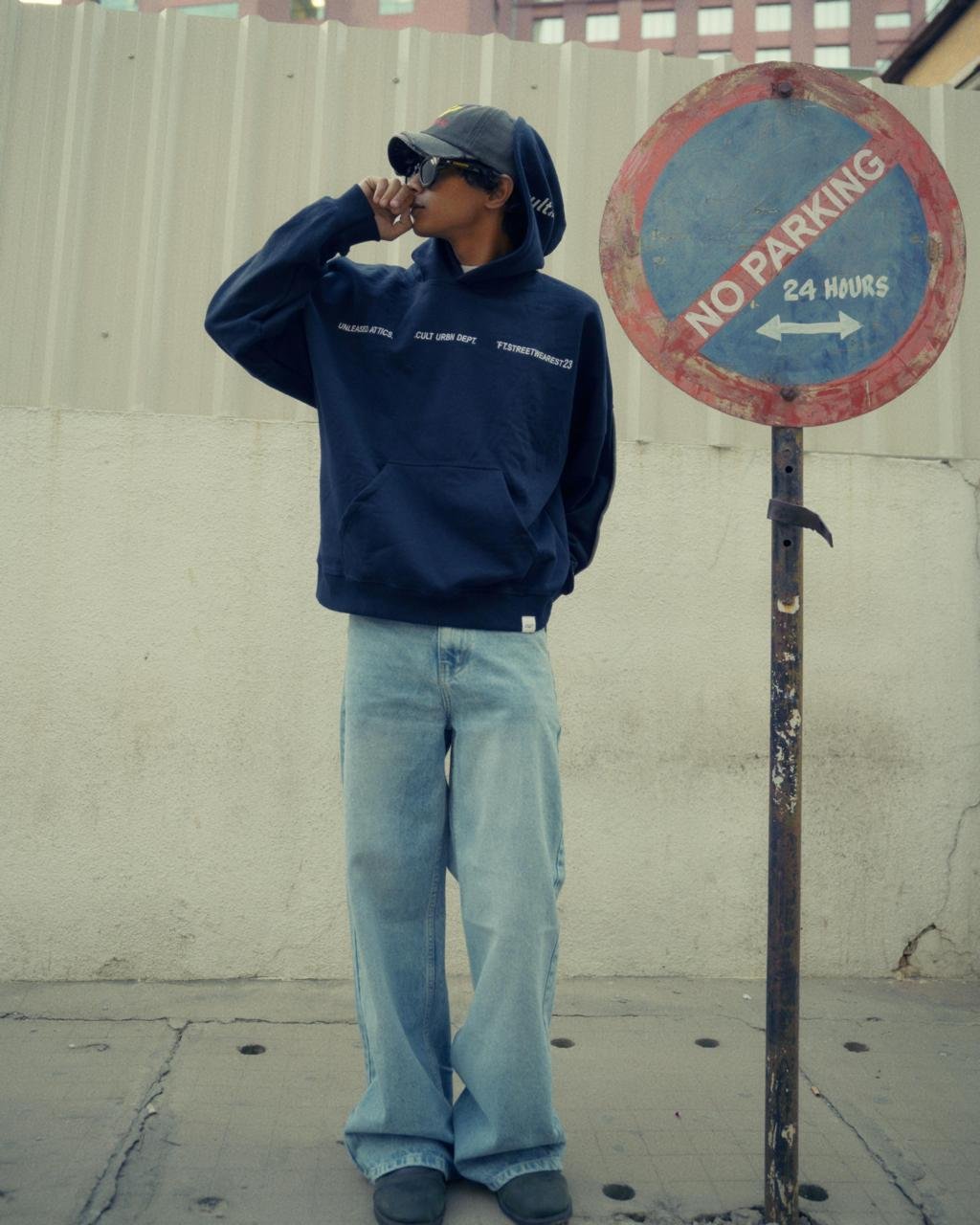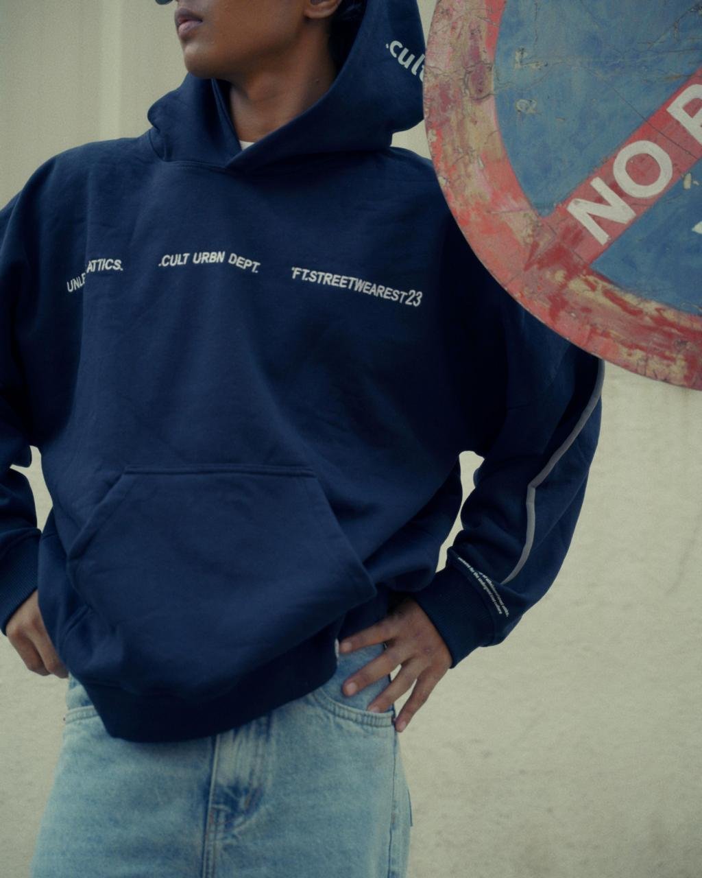 Made from premium-quality fabric, the hoodie provides a soft feel and a relaxed oversized fit that ensures all-day comfort. The deep navy tone combined with the minimalist typography creates a sleek and versatile look, making it easy to pair with jeans, cargos, or joggers for a complete street-style outfit.
