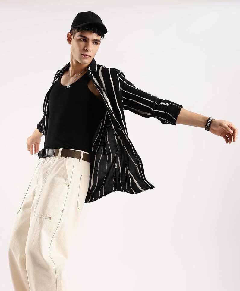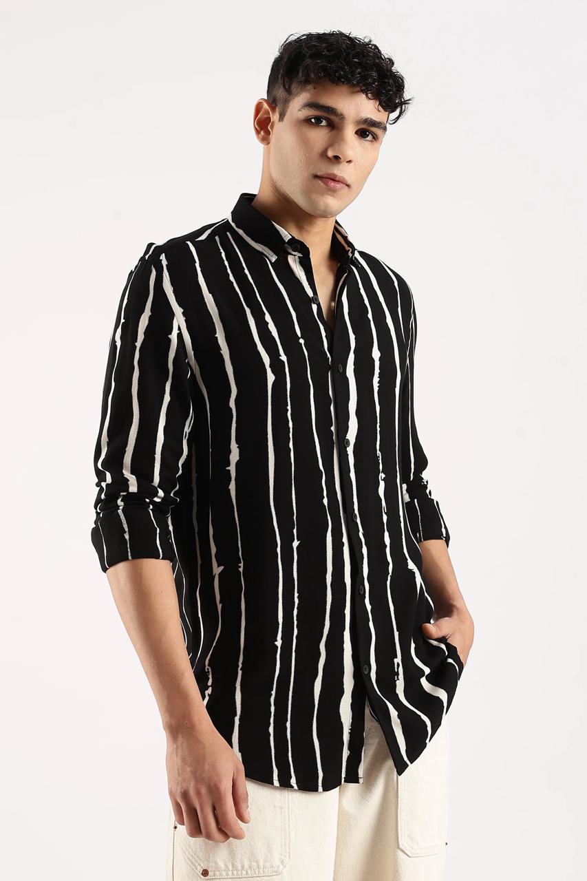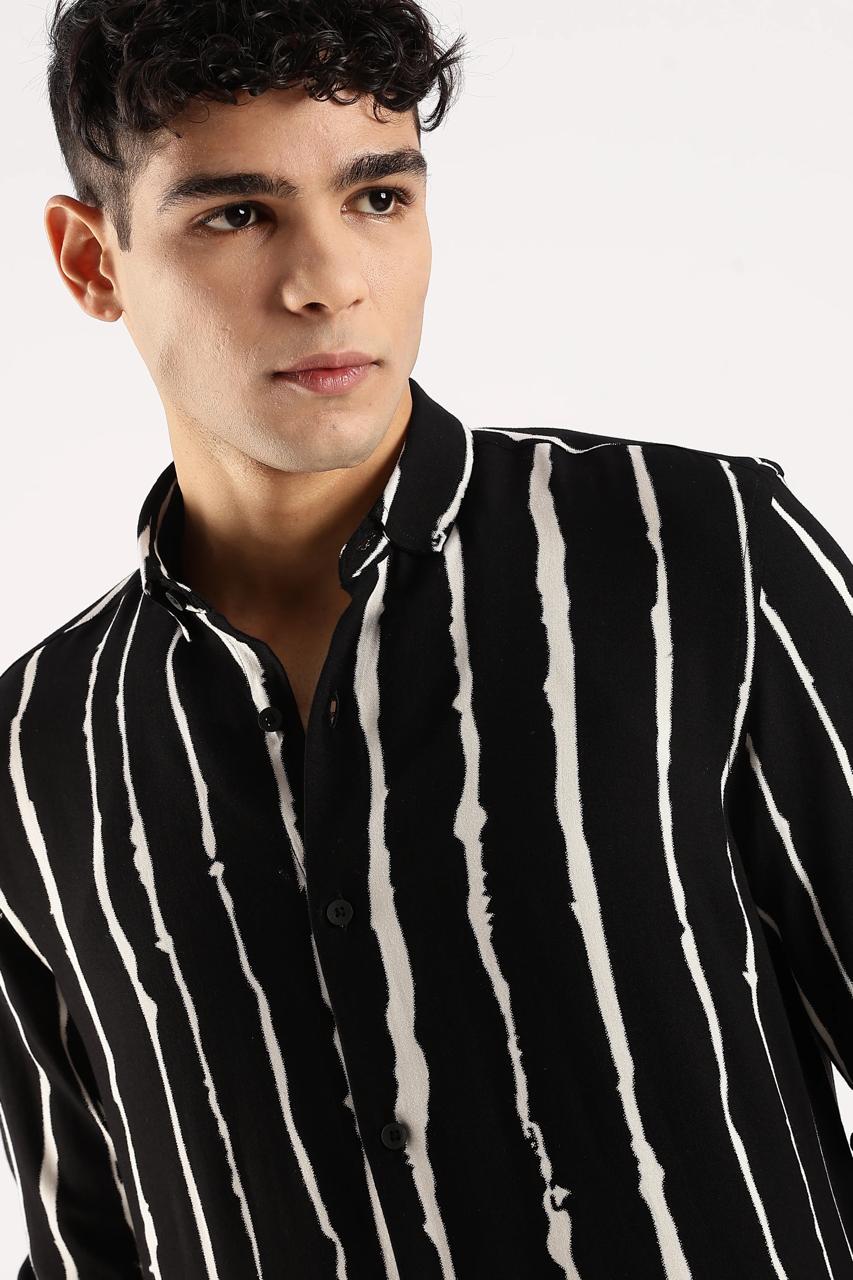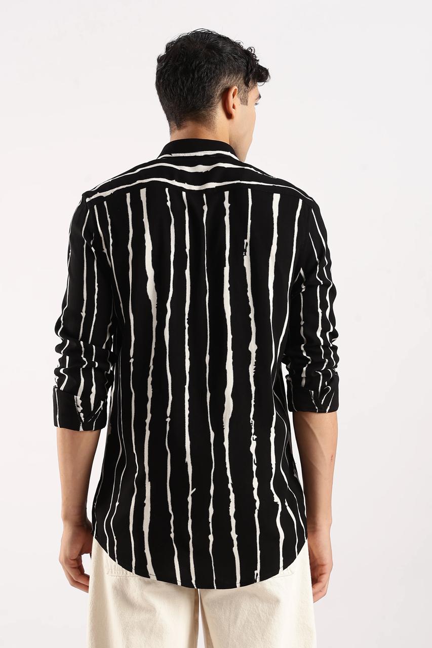 Make a sharp impression with this black and white striped slim-fit shirt crafted from soft, breathable viscose. The bold vertical print adds instant character while elongating the frame for a sleek silhouette.