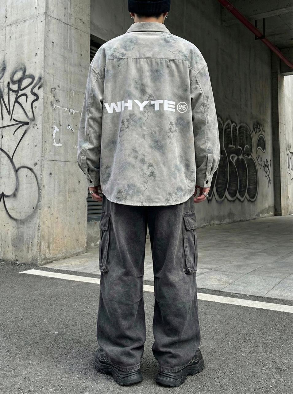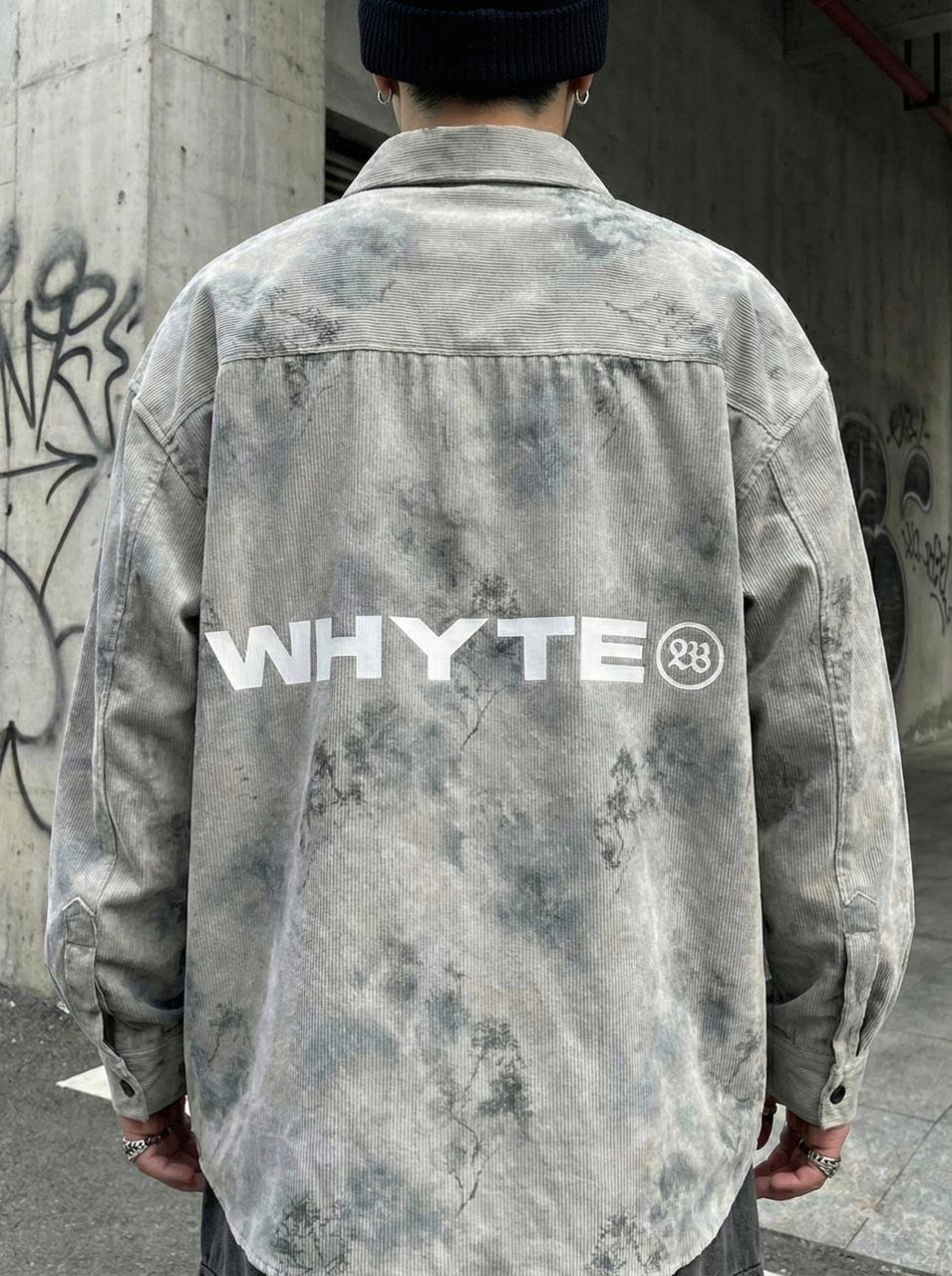 “Shop this Oversized Cream Corduroy Shirt featuring a unique acid-wash finish and bold ‘WHYTE’ back print. Premium streetwear style for a trendy look.”