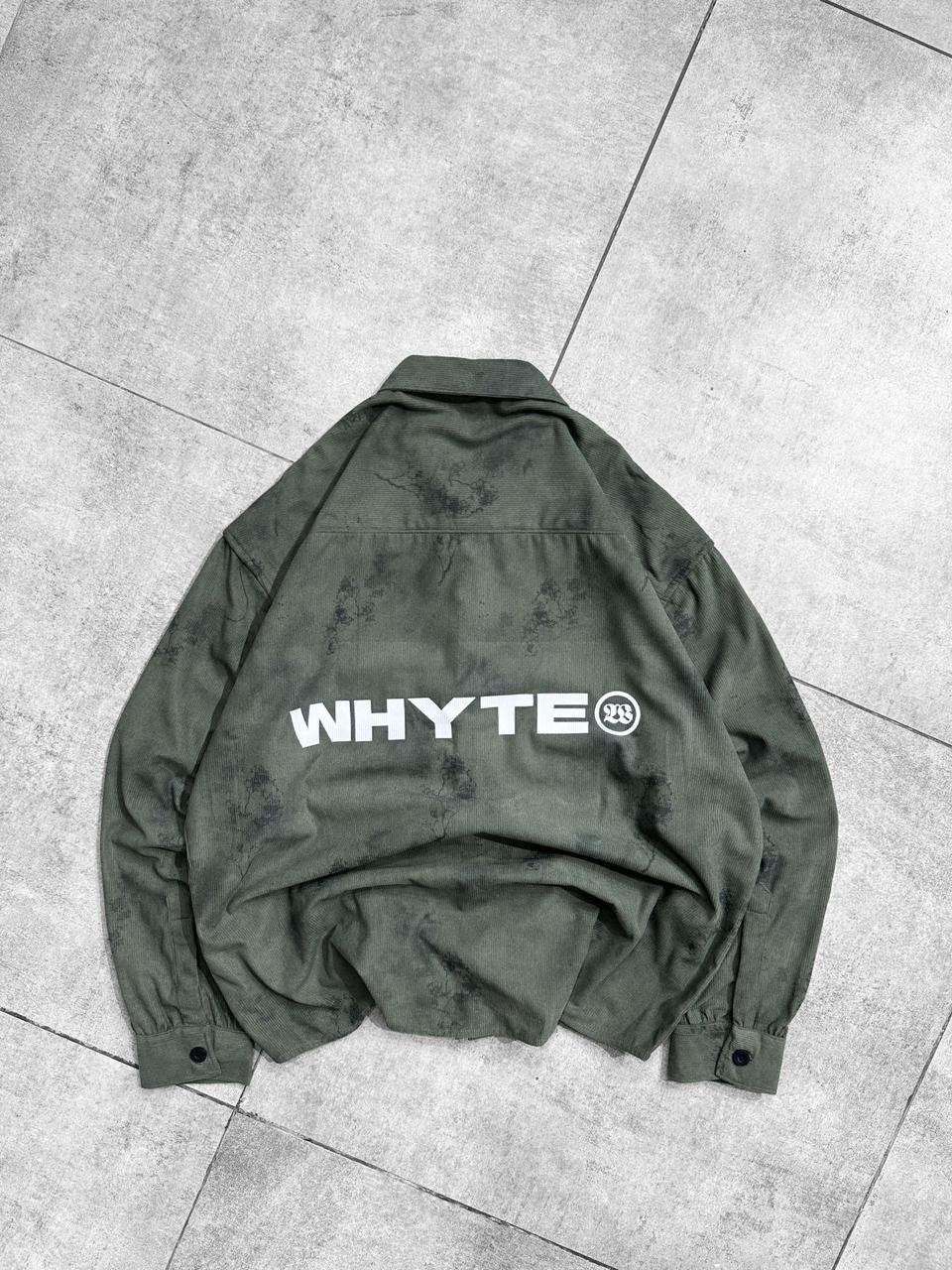 “Shop this Oversized Green Corduroy Shirt featuring a unique acid-wash finish and bold ‘WHYTE’ back print. Premium streetwear style for a trendy look.”