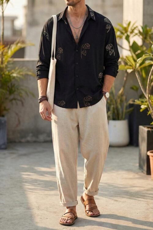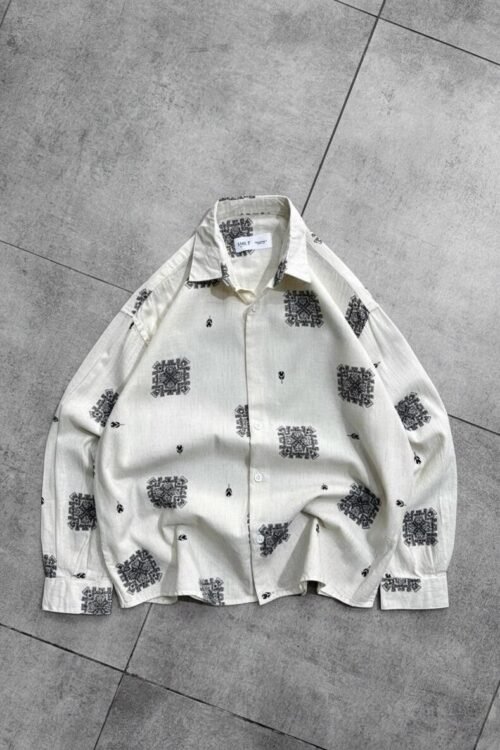 Geometric Linen-Blend Oversize Shirt This oversized button-down shirt features a clean, minimalist aesthetic with an artistic edge. Its cream-colored, textured fabric provides a premium feel, while the repetitive black geometric “mandala” patterns create a sophisticated, bohemian look.