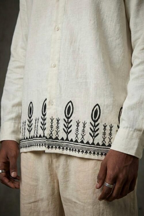 Tribal Hem Embroidery Dropshoulder Shirt – White Shop the Tribal Hem Embroidery Dropshoulder Shirt in off white. Features bold ethnic border embroidery, relaxed dropshoulder fit, and premium fabric. Perfect for modern streetwear looks. Fabric: Imp Linen Shirt Size: M,L,XL