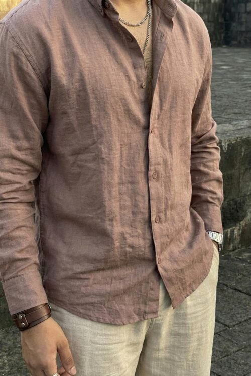 Plain Linen Oversize Shirt- Mauve Brown Linen Oversize Shirt Experience ultimate comfort in this breathable, textured linen-blend shirt. Featuring a soft collar, tonal buttons, and a relaxed boxy fit, it’s the ideal piece for a minimalist, high-fashion aesthetic.
