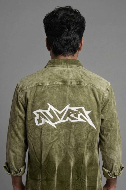 Auvra Back Printed Oversize Corduroy Shirt- Olive Green “Shop this oversized Light tan Streetwear Shirt featuring a premium Olive Green acid-wash finish and bold Auvra back graphic. Trendy, soft-touch button-down for an urban look.”